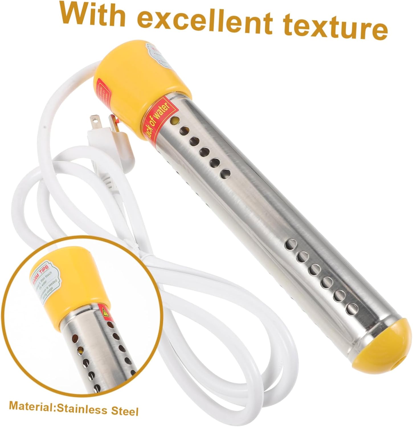 Package List 1 x heater Characteristics -Material:Plastic, anti-scalding bucket heater - Easy to operate: Soak in appropriate level of water. Plugs into any grounded wall outlet pool accessories -US : 110V pool heater -Color:Yellow portable pool heater -Size:26.00X5.00X5.00cm/10.22X1.97X1.97in water warmer -Rated frequency 60HZ small pool heater - power ensures fast heating speed, it only takes a few minutes to heat up heating tube for pool - Do not heat when using water. The leakage protection is not a power , please ensure that the water level is sufficient before use immersion water heater - Can evenly dissipate heat, use to prevent scalding damage to the container pool water heater -Rated voltage 110V submersible water heater -Rated power 1500W swimming pool supplies - The shield can protect the heating elements from direct with people or animals submersible heaterGoods Descriptionsubmersible heater It would be your helper for you.pool heater for inground pools Note: This item comes with US , please confirm the voltage of your area before purchasing.warmer for pool If you are looking for a pool warmer with reliable material and reasonable , I want to recommend this pool warmer for you.water heater for the pool We adopt stable material, can keep it for a long time.water warmer Meanwhile, it owns an attractive appearance design