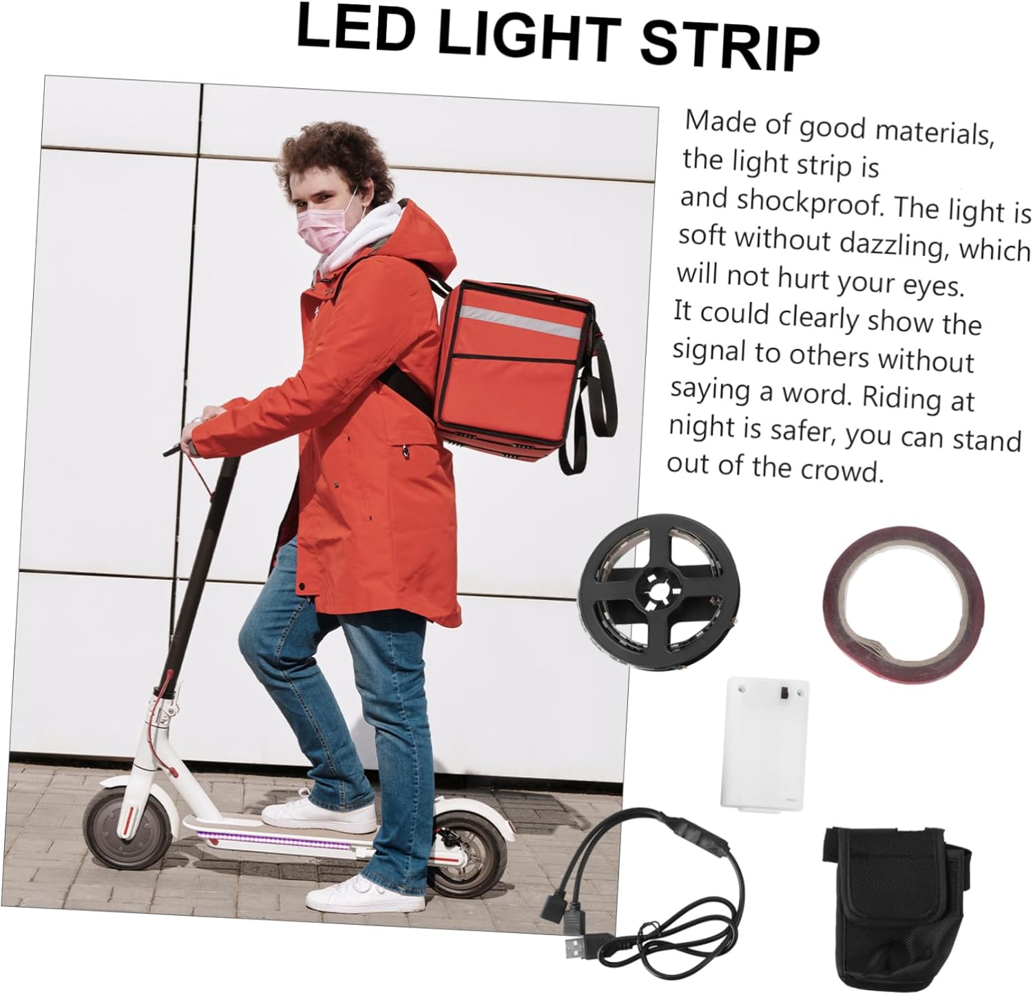 Package List 1 strip Features - Material: Electronic components, glue, plastic Electronic Scooter Parts. - Color: Black Scooter Refitment Parts. - Easy installation: With self-adhesive, it could stick to the seal firmly and quickly Light Strip Tool. - Size: About 50x1x0.2cm/ 19.65x0.39x0.08 inch Electronic Scooter Light Parts. - Riding at night is safer, you can stand out of the crowd Scooter Light Strip. - The light string provides various color options, depending on your choice of suitable light mode Scooter Parts. - The water resistance function ensures that works rainy or snowy days Scooter Lamp Strip. - Material with stable performance and Scooter Refitment Light Strip.Goods DescriptionScooter Fittings Riding at night is safer, you can stand out of the crowd.Scooter Accessory Made of materials, the light strip is waterproof and shockproof.Scooter Light Strip It could clearly show the signal to others a word.Scooter Refitment Light Strip This LED light strip is specially designed for scooter.Decorative Light Strip The light is without dazzling, which will not hurt your eyes