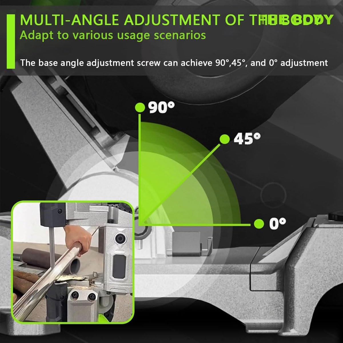 The metal bandsaw features a powerful 1100W motor with variable speed control for cutting unique materials and applications. Also, LED light illuminates the cutting position, ergonomic grip options, and an integrated hanging hook make your work easier. With 2 bladesFeatures:Features a dual switch design with LED lighting.With a detachable base, the band saw can be used alone or in combination.The base is equipped with adjustment screws and angle discs, which can be adjusted to achieve 0°, 40°, 90° rotation of the band saw, as well as 0°-45° different cutting angles.SpecificationsName:Band Saw With Base+WheelsPower: 1100WBand Saw Speed: 0.8-2.40m/SCutting Angle: 0-45°Saw Blade Size: 1140mm (L) × 12.5mm (W) × 0.6mm (Thick)Cutting Range: Round Material 110mm, Angle Material 105×105mmBody Weight: 13.5kgPackage List:1 × Band Saw1 × Base2 × Saw Blade1 × Instruction ManualNotes:1. Due to manual measurement, 2-3cm deviation is allowed.2. Different monitors have different calls, and the product color is subject to the actual product.