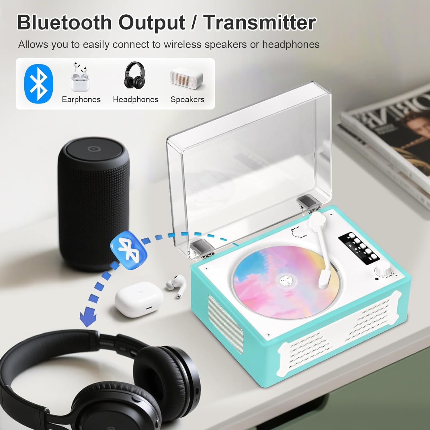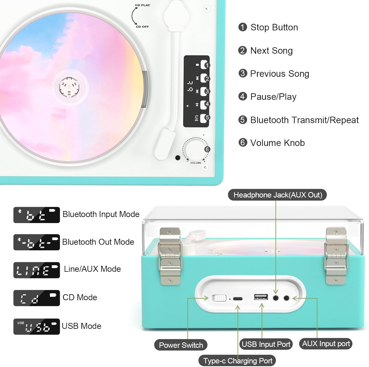 All-in-One Rechargeable Portable Bluetooth CD PlayerDetailed description:CD palyer featuring a handcrafted leather case, vintage look, antique metal hardware. A combination of romantic artwork, vintage aesthetics and modern technology.Putting on a CD and listening to an album, and the CD players take you on a fantastic musical journey, create your atmosphere and enhances your relaxation or music experience. Ideal for bedroom, office, party use, bring you a wonderful music experience.Key Feature:Built-in speakers: yesLED display: yesBluetooth: receiving and transmissionMP3-capable: YesSkip protection: yes Rechargeable battery: YesUSB-capable: Yes Auto-OFF: YesSpecification:Product Name: CD PlayerSize:8.03" x 6.03" x 4.09"Material: Faux LeatherBattery Capacity: 2000mAhUse time: 5 to 7hCharging Time: 2 to 3hInput Voltage: 5V 1ABluetooth Version: 5.0 Input & Output Note:1. CD player will shut down itself after 15 minutes of inactivity to save enery. Restart by turning it OFF for 5 seconds reboot.2. Turn the unit "OFF" when not in use or before a recharge for longer playback time.Parts List:1 x CD Player1 X Remote Control1 X Type-C Charging Cable1 X Instruction Manual