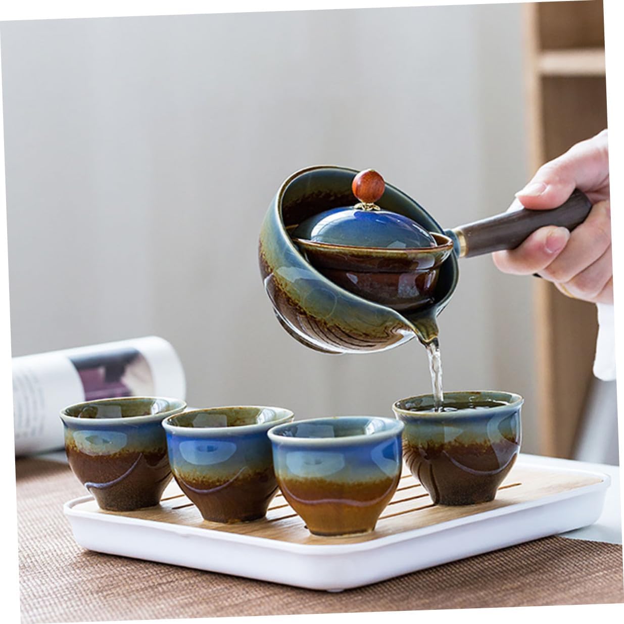 Package List 1 x tea pot 1 x tea tray 1 x bag 4 x cups Features -Color:Assorted Color -Size:5.50X5.50X4.00cm/2.16X2.16X1.57in (cup) -Material: Ceramic, canvas, foam, , wood -Product Info:Travel tea set - Suitable for making tea, kung fu tea, green tea, oolong tea, at home or in the office travel tea serving kit. - Its material is sturdy and , which is very and practical for the serving time. - An gift for yourself, family, friends, and those like drinking tea, also suits for travel use kung fu tea tray. - Unique design, elegant and fashionable, and comfortable in hand, easy to grip, and economic ceramic teacup kit. - The storage bag can protect your tea set from collision, perfect for outdoor travel or camping use portable tea pot.Goods Descriptiontravel teapot Do you like drinking tea? Are you looking for a set of portable travel tea set? If so, look no further! Our tea set will definitely satisfy your needs.travel teapot teacup kit This is a set of small tea set, which includes enough accessories, and can bring much convenience to your life