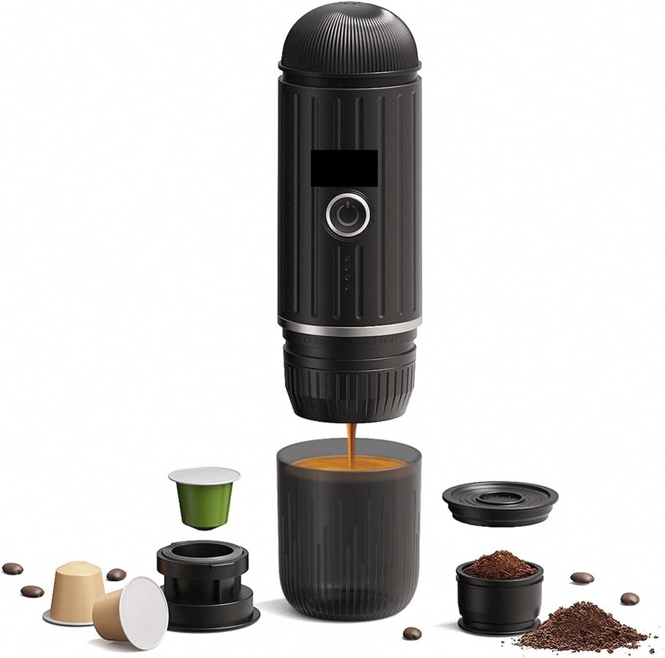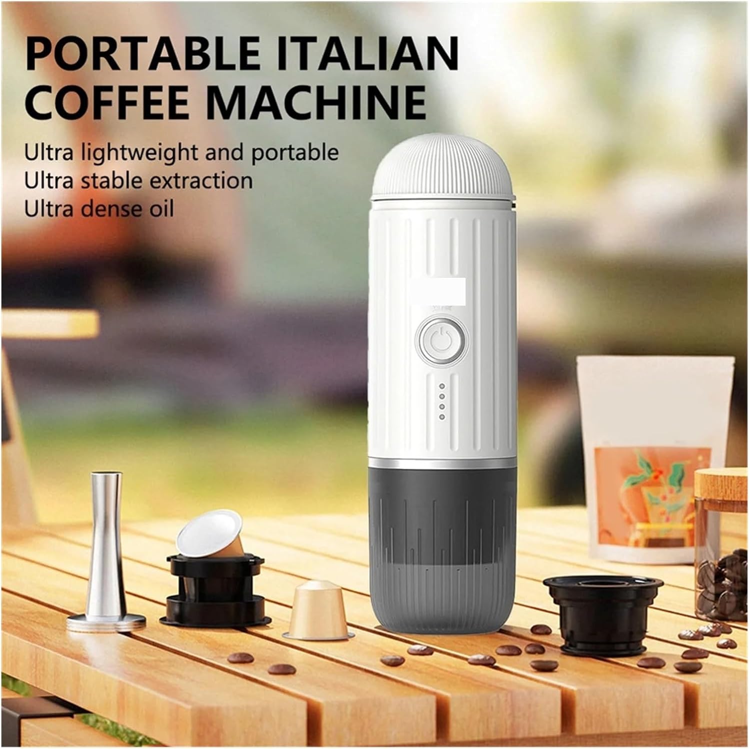 Portable & Cordless: The electric coffee maker allows you to enjoy a delicious cup of coffee anytime, anywhere. No power cord or socket required, perfect for traveling, camping, or even just enjoying a cup of coffee on the go.Easy to use and clean: Just add coffee and water, and the brewing pross will do the rest. The detachable design of the coffee maker makes it easy to clean and wash, making cleaning a breeze.Removable for cleaning Just add clean water and run the portable coffee machine without capsules - on to automatically clean the inside of the machine.The capsule adapter and food-grade coffee cup can also be easily removed and simply rinsed with water.One machine for both hot and coldSuitable for all kinds of drinking hot/cold waterk to display the battery charge.If you add hot water, double-k again to start brewing coffee;When adding cold water, press and hold for 2 seconds to automatically heat and brew coffeeTrue wireless heatingHeating cold water without electricityProduct size: 248x75mmPower: 100WCapacity: 80MLElectromagnetic: 7500 mAhMaterial: Food grade plastic, 304 stainless steel, ABS