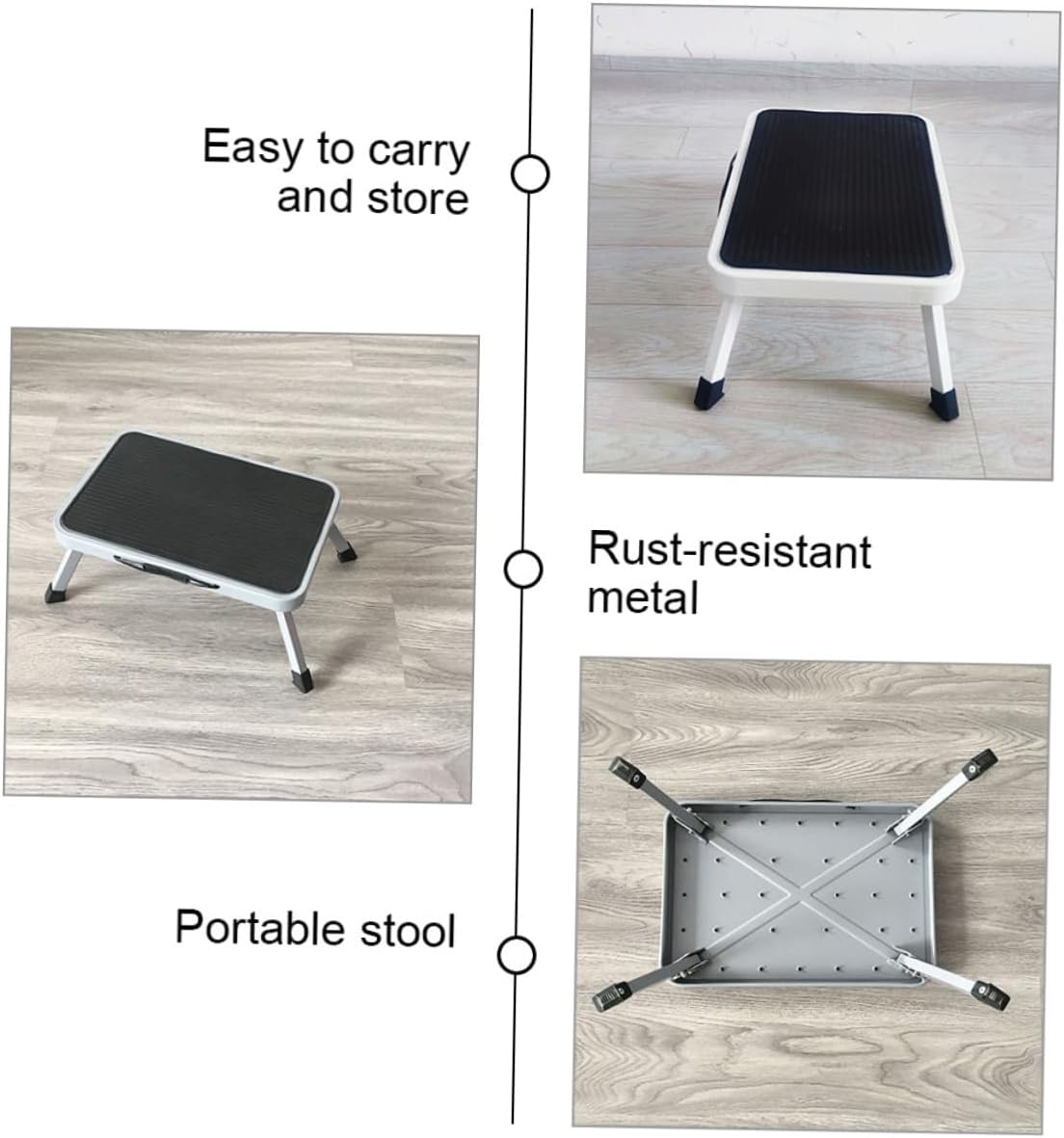 Package List 1 x foldable step stool Characteristics -Color:Black lightweight non-skid stool -Note: There is color difference office step stools -Material:Rubber, iron portable stool -Size:46.00X31.00X17.50cm/18.08X12.18X6.88in nonslip step stool -This stool is suitable for various activities, such as changing light bulbs, foldable design allows for storage easily. step stools -This stool is made of sturdy metal and features a nonslip platform to ensure safety during use in daily life. step stool for adults -This step stool is ideal for various indoor tasks such as reaching high shelves, changing light bulbs, or cleaning metal step stool. -This step stool is made of sturdy metal and features a thick and spacious platform, providing stability and stepping stool. -This portable step stool is designed for household use and is foldable for easily storage, can be convenient step stool for bathroom toiletGoods Information step stool This is a portable step stool for many kinds of people to use, made of metal and rubber material, safe and sturdy, can serve you for a long term.step stools for adults With detailed craftsmanship, simple but reasonable structure design, nonslip and has excellent load-bearing capacity, can meet your needs better and bring you a satisfying experience