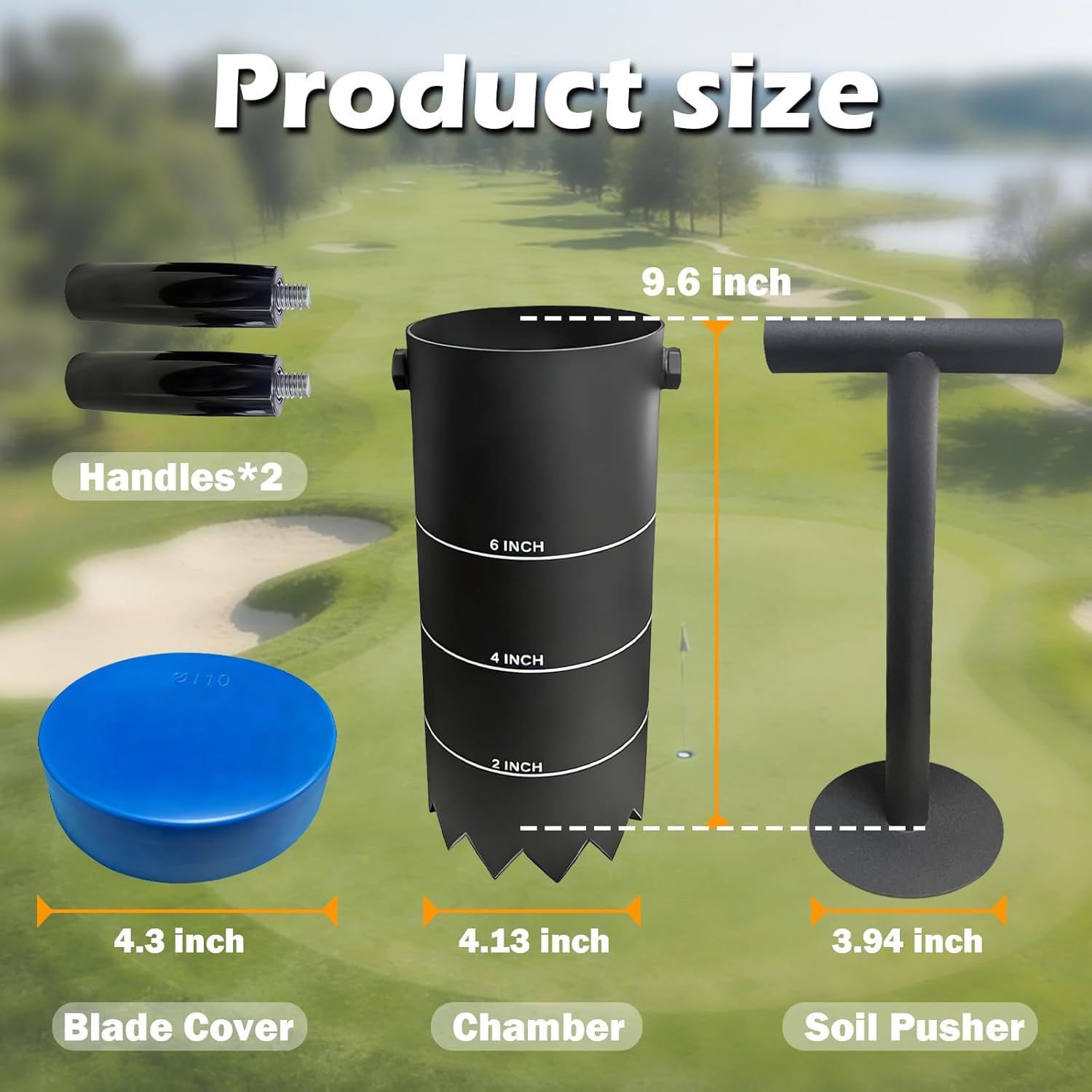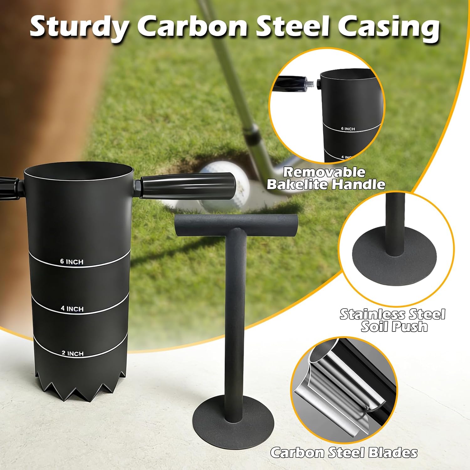 Turn your backyard into a professional putting green with this durable golf hole cutter. Designed to PGA/USGA standards, it features a detachable handle for easy storage, a built-in soil ejector for mess-free digging, and a sharp carbon steel blade that cuts through tough soil with ease. No tools required—just twist, press, and pull for a perfect hole every time. Makes a great gift for any golf lover.