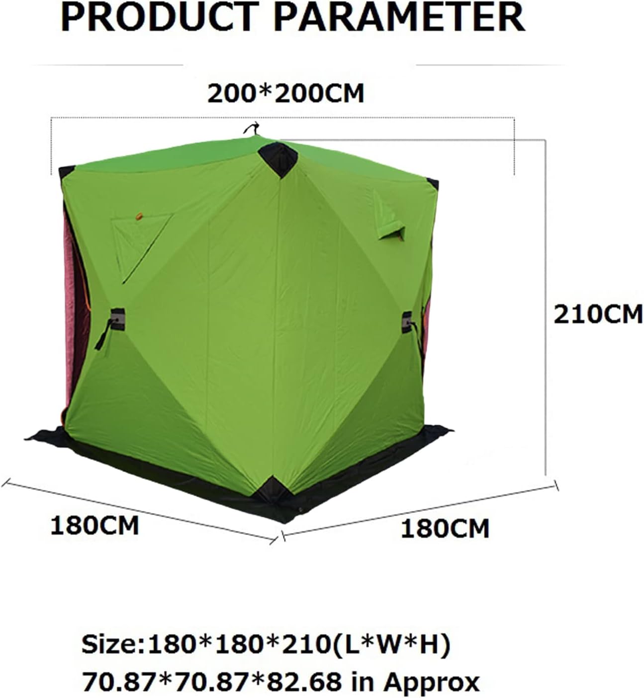 🐟Features:Hub design makes it quick to set up and take down.Made of oxford cloth with waterproof coating, waterproof, windproof and warm keeping.Thick cotton filling prevents cold wind and keeps you warm.Removable windows give clear views outside and good venting.Great for ice fishing, camping, hunting, dressing, showering, etc.Comes with a carry bag for easy transport.🐟Specifications:Shelter Material: 210D Oxford ClothPole Material: Fiberglass Color: GreenSize:Approx. 200*200*210cm / 78.74*78.74*82.68inFunction: Suitable for 3-4persons ice fishing🐟Package List:1 * Ice Fishing Shelter4 * Peg4 * Rope1 * Packing Bag🐟Notes:Due to the light and screen setting difference, the item's color may be slightly different from the pictures.Please allow slight dimension difference due to different manual measurement.