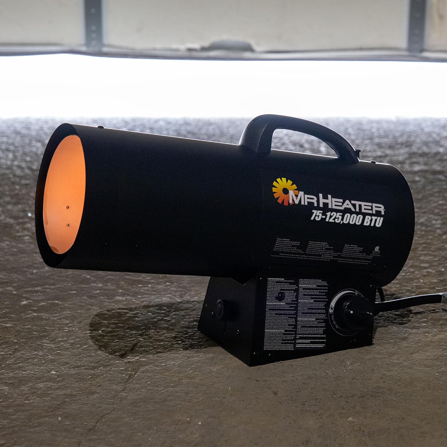 Mr. Heater's Portable Forced Air Propane Heater delivers powerful, reliable warmth wherever the job takes you. With 125,000 BTUs, this rugged unit easily heats up to 3,125 square feet, making it the ideal solution for construction sites, workshops, garages, and outdoor events. It comes with a standard 10ft. hose and regulator and all the safety you would expect of a Mr. Heater product