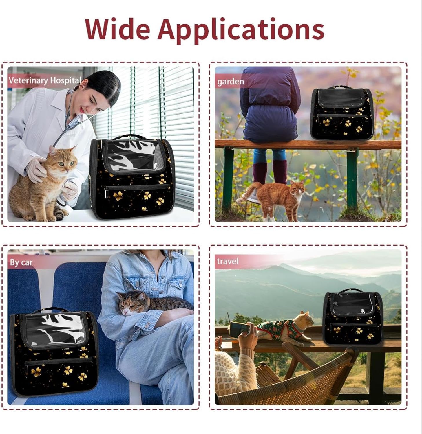Well made: Cat Backpack Carrier is made from 900D oxford fabric, pp webbing, velvet, nylon, which is very sturdy, environmentally friendly and breathable. Not easily scratched by pet’s claws, pet backpack carrier is SAFETY & ANTI-SCRATCH. The back padding will give you a comfortable and breathable experience. Ventilated Backpack: With a breathable window in the front, this pet backpack allows cats to enjoy the sun without feeling stuffy. There are two side pockets and one big front pocket, and you can take foods or toy for your kitten pet. It is big enough for cat to turn around, and there are side pockets and hook holes, you will enjoy the greatest convenience when taking your cat out. Perfect size: Cat carrier is 15.75x9.84x13.78in/40x25x35cm. Fits most small/medium sized cat, dog, and pet. Quality fleece bed provide a comfortable place for your pet. Lightweight and easy to carry to all places. Built-in harnesses keep your naughty friends from escaping. Removable cosy mat for easier cleaning and let your pet enjoy it inside. Easy to carry: The adjustable shoulder strap of pet carrier bag help you hands-free carrying and makes it the most safe and convenient pet carrier bag for your travel. Seat belt design provide pets with safety protection throughout the trip. Pad protection keep your pets comfortable during travel. Unique Design: Innovative inside graphic design gives you a stereoscopic 3D visual experience. You also send us the photos you interest to make your unique dog or cat carrier. Pet bag is also a amazing gift for pet lover.