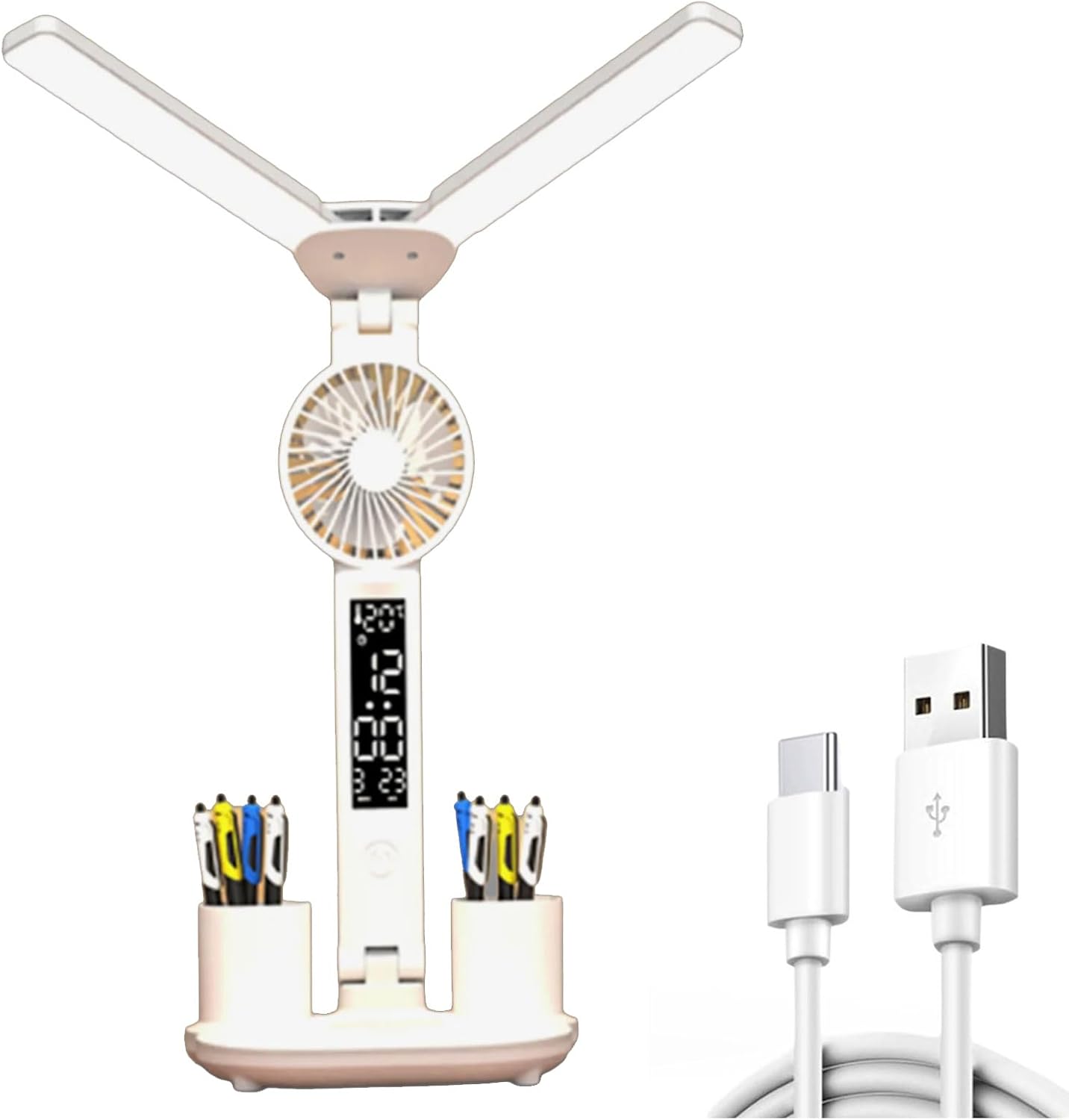 Portable USB Charged Desk Light with Two Head and Silents Fan Feature for Students and ProfessionalFeatures:the convenience with Two Head Touches LED Desk Lamp Fan, a game changing for work and study This device features adjustable brightness, color temperature setting and 360 degree rotating fan with whispers quiet operations.for office workers, students, and home users, the lamp fan to anyone in need of cooling Perfectly for use in office, study room, bedrooms, or living area, it meets both your ventilation needs with styles and efficiency.from this USB powered multifunctional gadget is not only a practical addition to workspaces but also accessory that complements.Specifications:Materials: Type Charging 3200mAh, USB plug(optional)Package Includes:1PC LED LampNote:Please allow 0-1cm error due to manual measurement. make sure you not mind before bid.Due to the differences between different monitors, the picture may not reflect the actual of the item. Thank you!