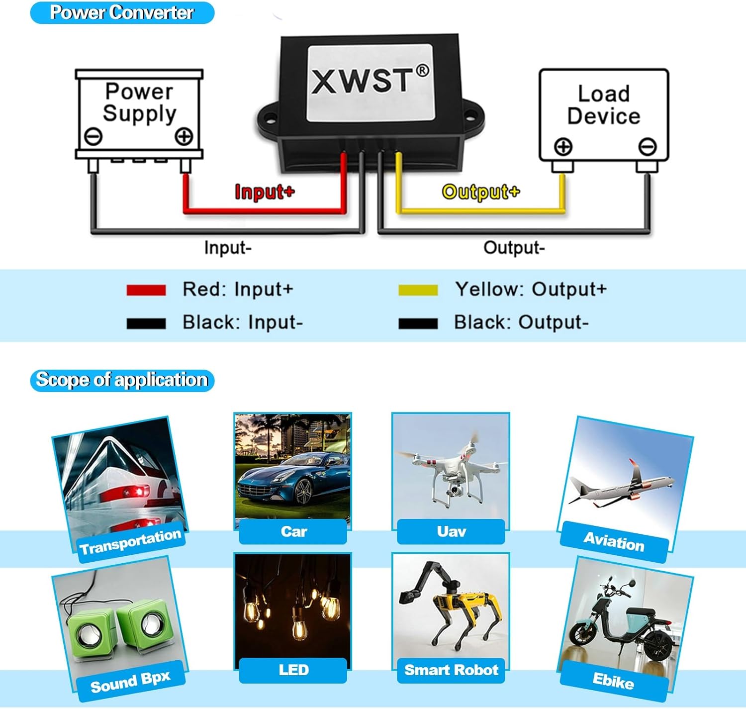 ConvertersPower ConvertersModule Properties:Non-isolated moduleInputVoltage: DC 12V24V36V48V60VInputVoltage Range: DC 09-72VOutput Voltage: DC 6VOutput Current:1-5AOutput Power: 6W-30WConversion Efficiency: >93%Cable Length: 13-14cmRipple (Full load test): 40mVNo-loadcurrent: 25mAWorking Temperature: -40~80Waterproof Rating: IP67Product size and weight :ABS Plastic L 58*40.5*22MM 100g/pc