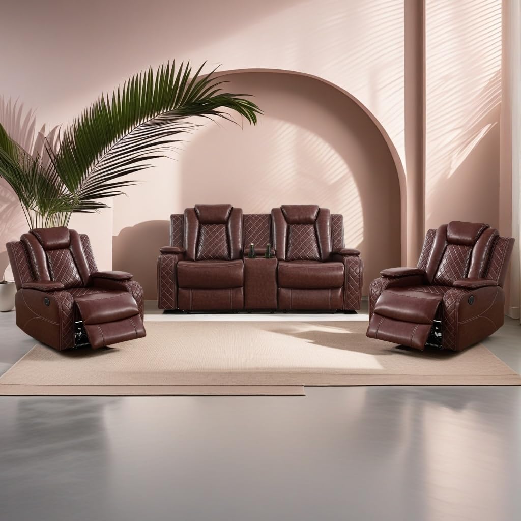 Power Recliner Sofa Set: This power reclining sofa set features durable bonded leather, pillow top backrests and armrests both are evenly filled with high density memory foam and quality springs for comfort. Detail Design: The sofa set offers 6 seats with 5 recliners that feature adjustable backrests (90-160 degrees) and leg rests (0-90 degrees). It also features USB ports, wireless charger, cup Holder and hidden armrest compartments for added convenience. The drive motor is adopted high quality motor, running quietly and smoothly without vibration; the ambient light is made of low voltage and weak current LED light, no heat, power saving and safe; All electrical parts including USB ports have been tested hundreds of times. Easy Assembly: No tools are required for installation, simply slide the backrest into the sofa base for relaxing. In terms of usage,you just press the button beside the armrest to adjust the backrest and footrest to your preferred angle. Dimensions: 3 Seat Sofa Size: 84"(W) x 39" (D) x 42" (H); Loveseat Size: 74"(W) x 39" (D) x 42" (H); Chair Size: 39"(W) x 39" (D) x 42" (H). Each seat can hold up to 330 pounds, offering comfortable experience for you.