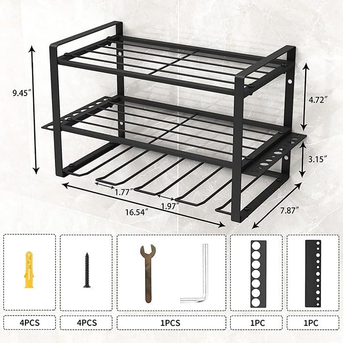Upgrade your garage or workshop organization with our versatile Power Tool Storage Rack. Designed in a sleek black finish, this robust metal rack is capable of holding up to 68kg (150lbs), making it the ideal solution for both heavy-duty tools and everyday essentials. The 3-layer design features dedicated spaces for your tools, including 4 drill holders, a screwdriver holder, a pliers holder, and a hammer holder. This thoughtful layout not only maximizes storage efficiency but also ensures that your tools are easily accessible when you need them, reducing clutter and saving you time during projects. Installation is a breeze with our wall-mounted rack, perfect for various surfaces such as brick walls, wooden boards, or pegboards. Transform your workspace into a tidy and functional area where every tool has its place. Whether you are a DIY enthusiast or a professional tradesperson, this Power Tool Storage Rack enhances your workflow by providing a reliable and organized storage solution. Invest in your productivity and enjoy the convenience of having your tools organized and within reach. Package includes one Power Tool Storage Rack, ready to elevate your space.