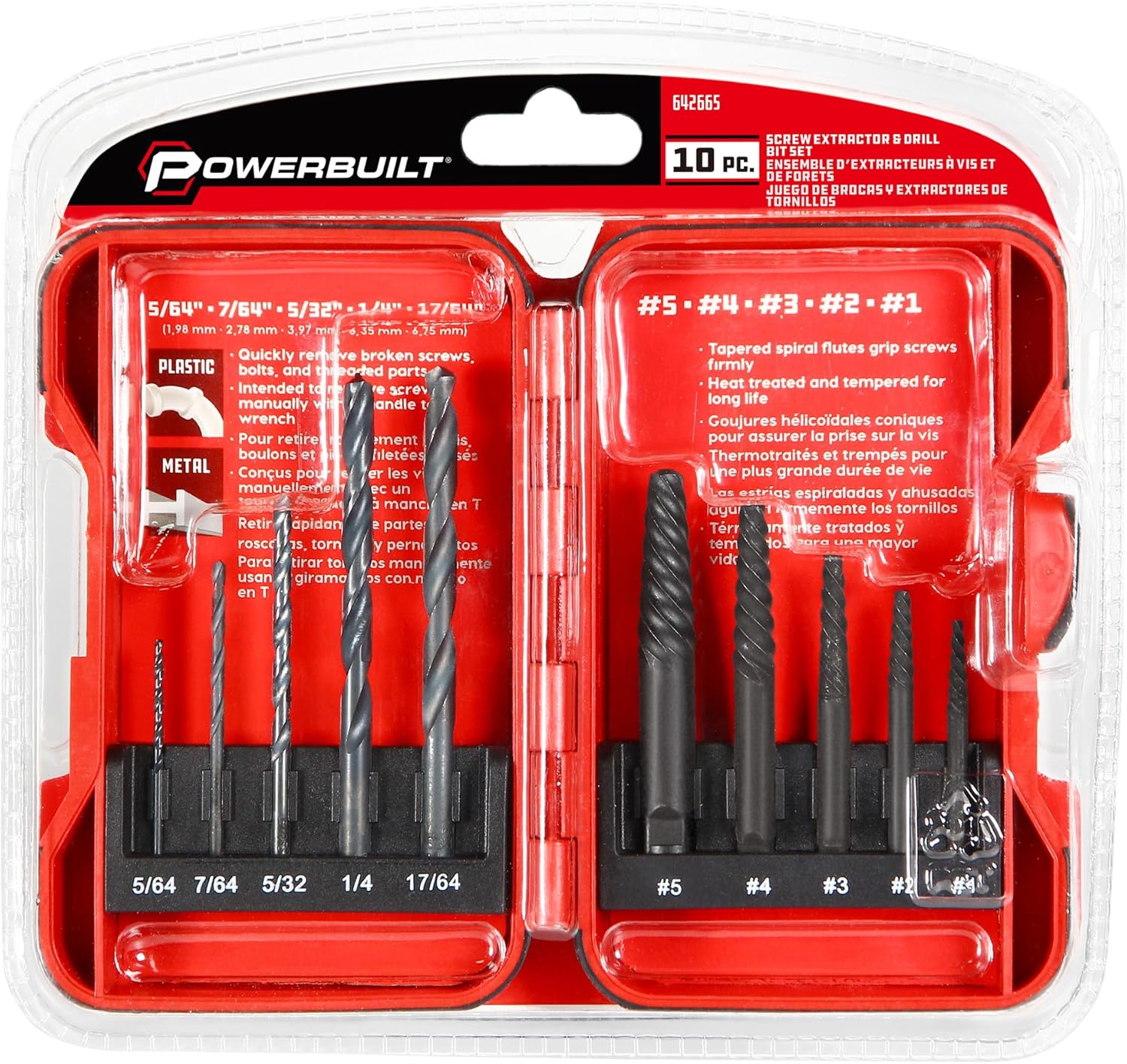 Seized or stripped bolts and screws are a common problem that can be a hassle to remove without the right tools. Drilling, tapping and extracting makes for easy removal if you have the Powerbuilt 10 Piece Drill and Screw Extractor Set. This set features strong 5 HSS roll forged drill bits with a black finish and 5 milled screw extractors to bite into the stuck fastener. Drill sizes include 5/64 inch, 7/64 inch, 5/32 inch, 1/4 inch, and 17/64 inch. The 5 milled screw extractors size include #1, #2, #3, #4, and #5.