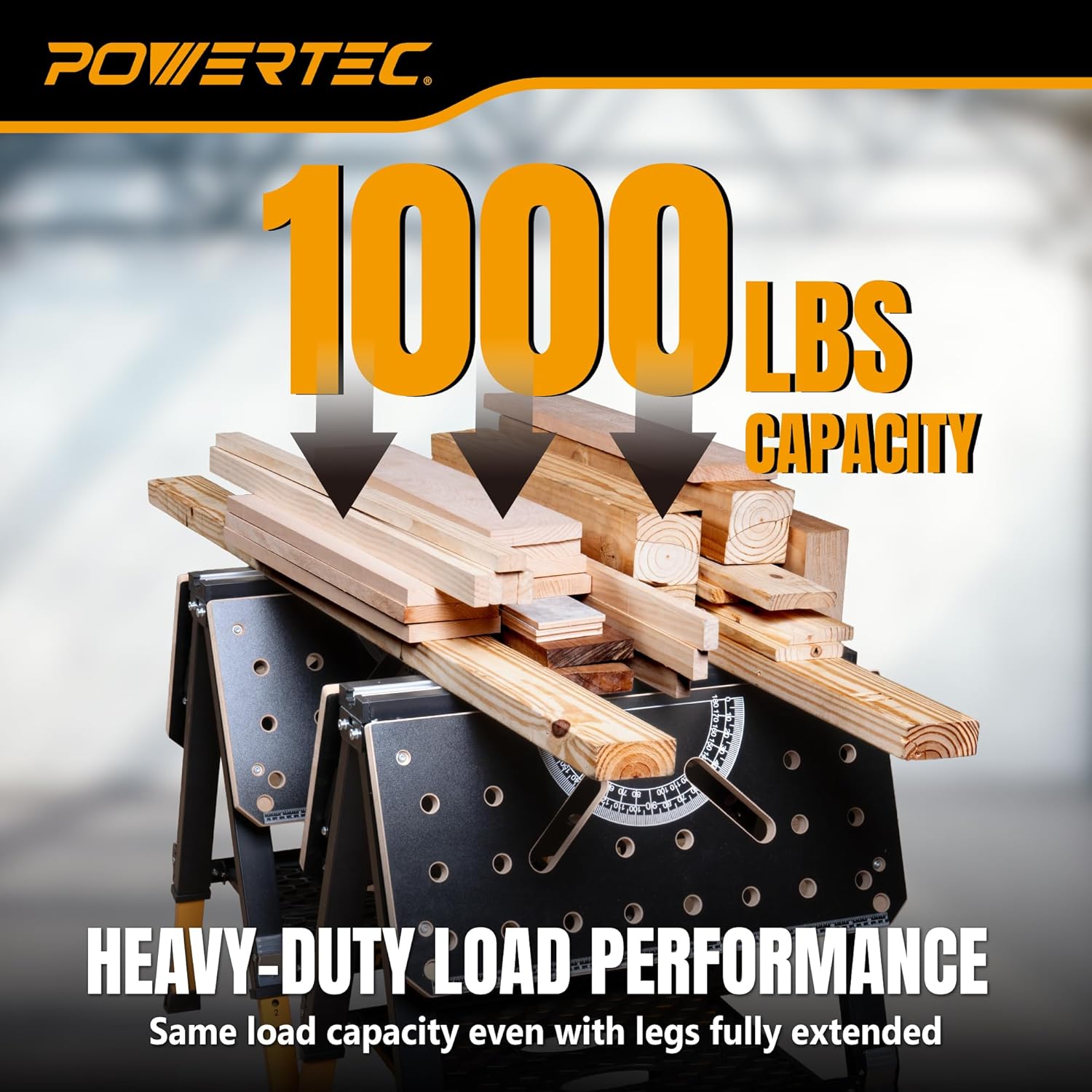 Stop compromising between a workbench and a sawhorse. POWERTEC UT1015 gives you both in one rugged, expandable system. With a massive 1000 lb load capacity, patented 8-level height adjustment, and independently adjustable legs for uneven terrain, this table is built to perform where others fall short. Use it as a stable precision workstation for detailed assembly and finishing, or fold it into a heavy-duty sawhorse capable of supporting long lumber, sheet goods, and equipment. Integrated clamping slots, 36 bench dog holes, and included accessories give you professional-grade material control right out of the box. Need more space? Connect multiple tables or span them with 2x4s to create a large-scale support platform, no custom fabrication required. When the job is done, it folds down slim for easy storage and transport.