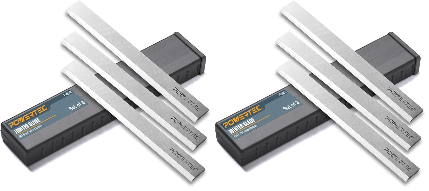 Product Description Introducing the 6-1/8 Inch Jointer Planer Knives (3pcs) Set by POWERTEC.These woodworking cutting tools are intended to serve as premium blade knives for your jointer machine. Each blade possesses an impressively sharp single cutting edge that produces high precision cutting action for a variety of workshop applications.Premium BuildDesigned with a M2 high speed steel construction that offers a combination of durability, along with wear and heat resistance. These HSS blades allow you to cut at higher speeds when compared to traditional alloys. These blades are suitable no matter you're a professional or hobbyist. This not only improves your efficiency and workflow, but your cutting capabilities as well. They also come equipped with machined locator (mounting) holes that help you safely align the knives to the jointer cutting head with minimum effort.Compatible WithCraftsman: 21705, 922995Ridgid: AC8600, JE080008, JP0610Blade SpecificationsMaterial: High Speed SteelLength: 6-1/8" (155.5 mm)Width: 11/16" (17 mm)Thickness: 1/8" (3.1 mm)POWERTEC is a leading manufacturer of high quality woodworking tools and accessories, machines, and an assortment of OEM replacement parts. We are committed to exceeding expectations, while bringing the latest innovations, technology, and product development to the industry. From the Manufacturer POWERTEC High Speed Steel (HSS) Knives are made of premium High Speed Steel (HSS) with performance that meets or exceeds OEM product. The manufacturing process started with premium HSS material, followed by strictly professional machining and quality control that ensure extreme sharpness, precision, balancing, and tight tolerance in every piece of "POWERTEC HSS Knife" product. The final Heat Treatment enhances the hardness and durability. "POWERTEC High Speed Steel (HSS) Knives" stay sharp and last longer than conventional product. We guarantee that "POWERTEC High Speed Steel (HSS) Knives" meet or exceed OEM quality and industrial standard.