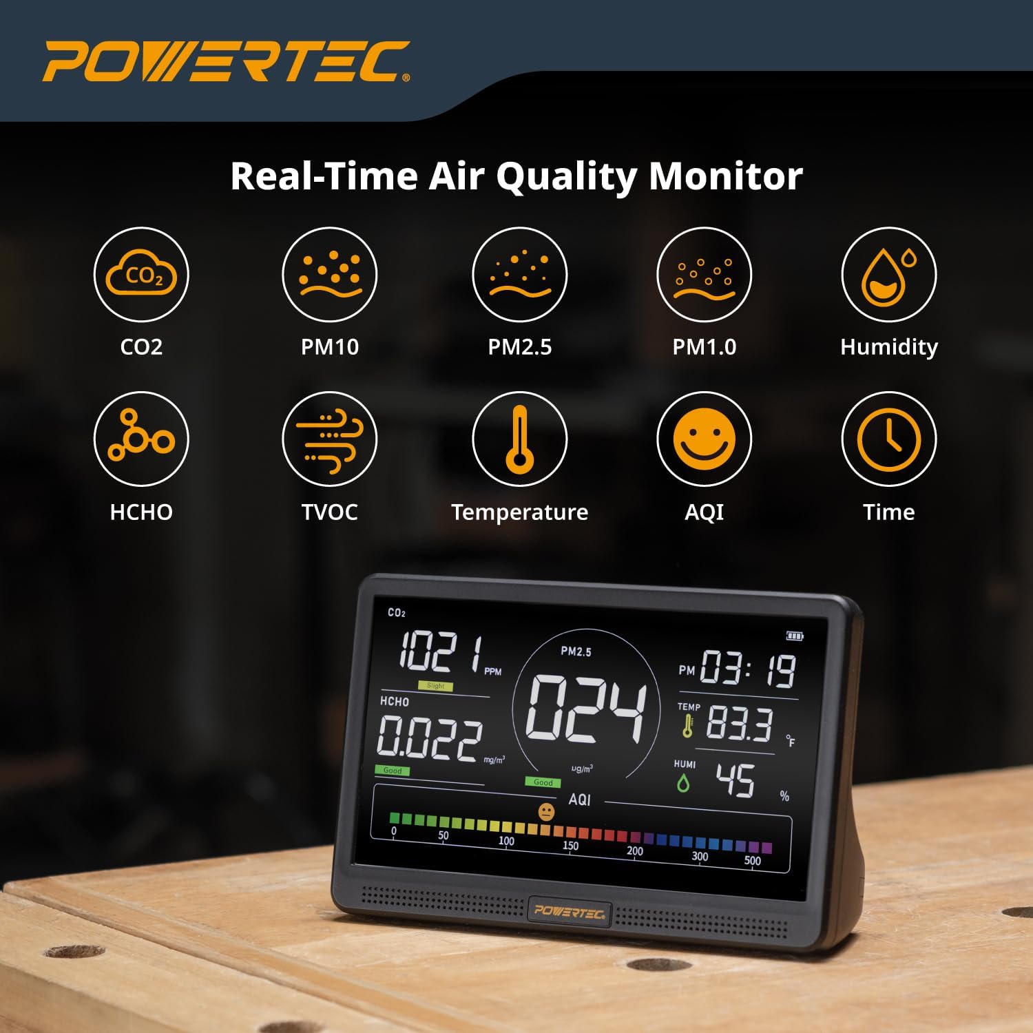 POWERTEC AD1001 Air Quality Monitor with 7-Inch LCD Display Advanced Multi-Sensor CO₂, PM2.5, PM10, HCHO, and TVOC Detector for Workshop, Home, or Industrial Use Stay in control of your workspace air quality with the POWERTEC AD1001, a professional-grade monitoring solution designed for woodworking shops, garages, and indoor environments. Engineered with next-generation NDIR CO₂ sensors, this device delivers enhanced accuracy and faster response times—outperforming standard low-cost air monitors. Equipped with multiple precision sensors, the AD1001 tracks fine particulate matter (PM1.0, PM2.5, PM10), formaldehyde (HCHO), total volatile organic compounds (TVOC), temperature, and humidity, giving you a complete snapshot of your air quality in real time. The 7-inch full-color LCD display clearly presents all data at a glance, with color-coded air quality indicators (green, yellow, red) and audible alarms to instantly alert you of unsafe conditions—helping you take immediate action to protect your health and workspace safety. With a built-in 2500mAh rechargeable battery, the unit offers up to 6 hours of cordless operation and can also be used while plugged in. Simple touch controls, quick calibration, and adjustable brightness make it easy to operate in any environment. From workshops and warehouses to greenhouses and homes, the AD1001 delivers accurate, reliable, and professional air quality monitoring—so you can breathe easy and work smarter.