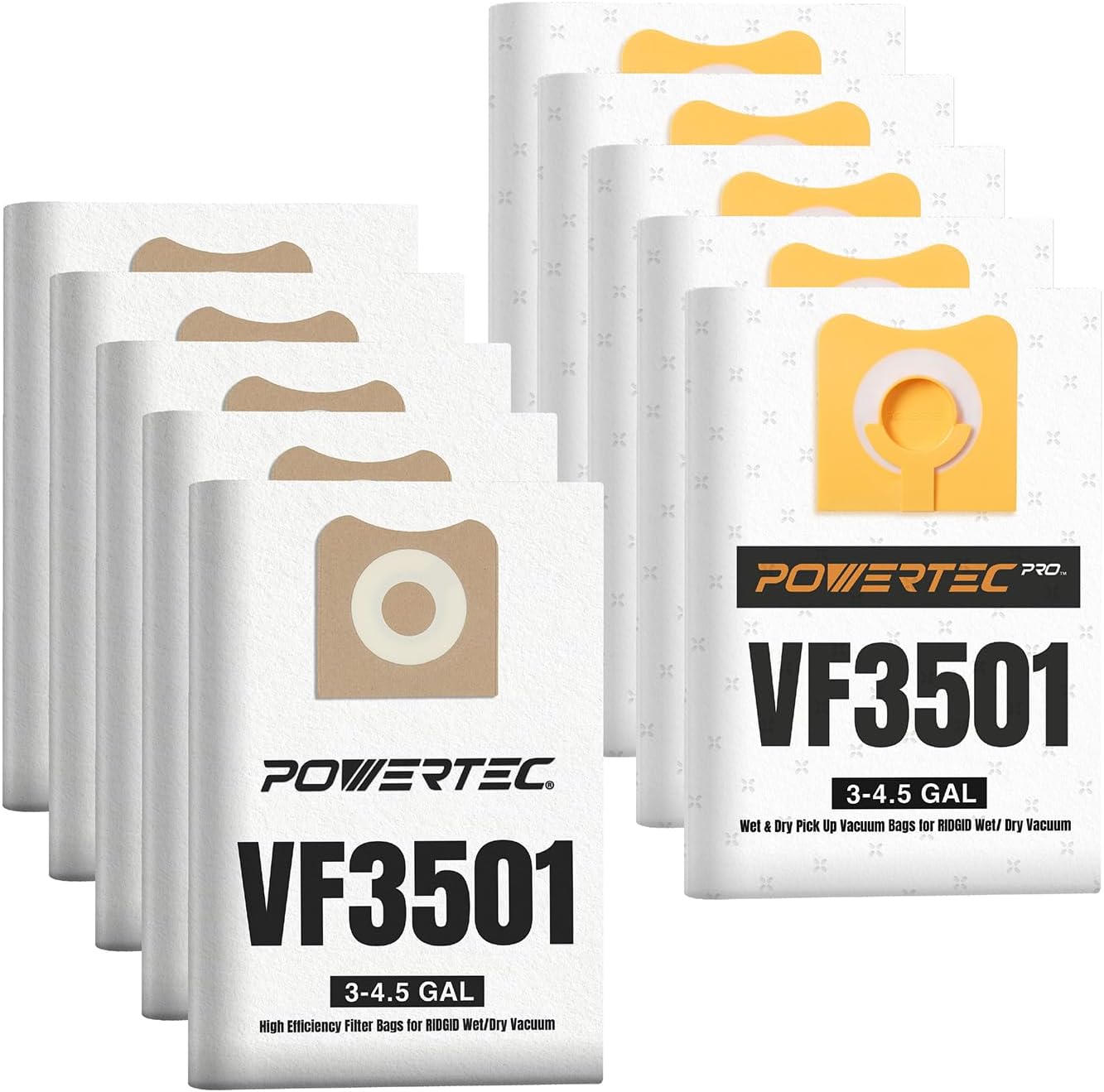 Introducing the Water-Resistant RIDGID Wet Dry Vac Filter Replacement Bags by POWERTEC. Say goodbye to clogged filters and frustrating spills. These high-efficiency filter bags boast a unique combination of features that make them your new dust collection and workshop cleaning go-to. Double Duty Wet and DryTackle any project, from sawdust and wood chips to spilled liquids and muddy messes. The water-resistant material handles it all. Effortless Dust CaptureTrap fine drywall dust, sawdust, and everyday dirt with ease. The secure rubber seal locks everything in, preventing backflow and messy cleanups. Optimal DurabilityMade with premium materials, these bags are built to last. Effortlessly tackle both wet messes and dry dust debris without sacrificing performance or damaging the vac.Convenient DisposalReplace the bag within seconds and pop in a fresh one. Simply toss the old bag, no fuss, no muss, only higher efficiency. ApplicationsHomes: Keep dust bunnies and pet hair at bay.Garages: Conquer sawdust and debris after DIY projects.Worksites: Woodworking dust collection. Clean up spills and messes with ease.Replacement for RIDGID Dust Filter Bag: VF3502 (23743)Compatible with RIDGID 12 - 16 Gallon Wet /Dry Vacuum models:12 Gallon Vacuums: HD1200 | HD1280 | MOB1200 | MOB12000 | 50333 (1250RV) | 62703 (RT1200) | 929866 (WD1270) | WD1245014 Gallon Vacuums: HD1400 | HD1401 | 50368 (RV2400HF) | 50348 (1400RV) | WD145016 Gallon Vacuums: WD1640 | HD1800 | HD1600 | HD16000 | HD1640 | HD16400 | WD1956 | 50363 (RV2600B) | MOB1600 | MOB16000 | 29803 (WD1850M) | 50338 (1650RV) | 62723 (RT1600) | HD16100 | WD1680 | WD1850 | WD1851 | WD1950 POWERTEC is a leading manufacturer of high quality woodworking tools and accessories, machines, and an assortment of OEM replacement parts. We are committed to exceeding expectations, while bringing the latest innovations, technology, and product development to the industry.