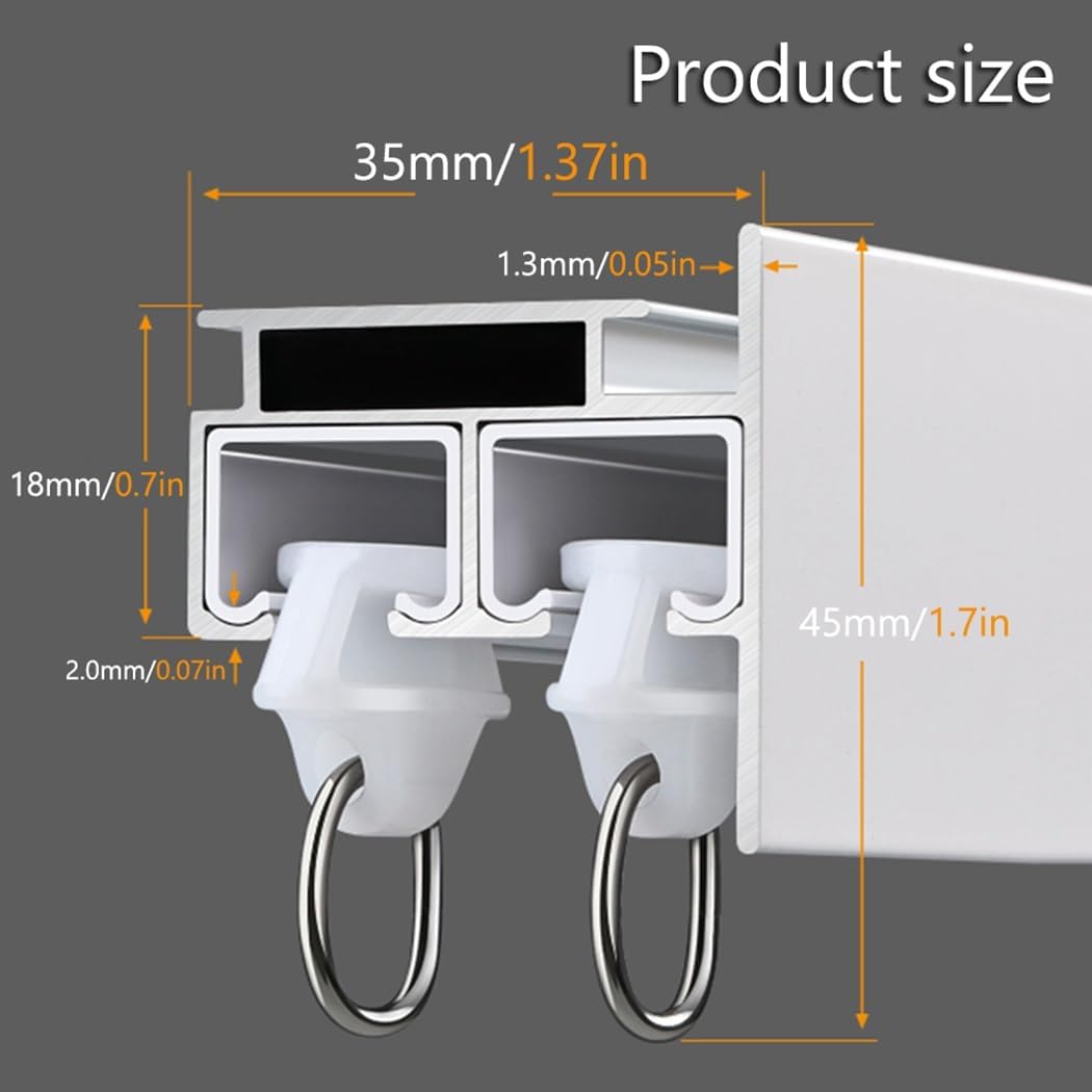 Transform your living space with our versatile aluminum curtain rails, designed to enhance both small and large areas while meeting your aesthetic preferences. Perfect for a range of applications, these curtain tracks are ideal for living room panoramic windows, bedroom bay windows, children's rooms, study areas, hotel banquet halls, office partitions, commercial exhibition spaces, sunrooms, and master bedrooms.Key Features:- Durable Material: Made from high-quality aluminum, ensuring longevity and resistance to wear.- Customizable Length: Available in lengths from 70 to 600cm (2.3 to 19.7ft), allowing you to adjust to your specific needs. For lengths ≥100 cm (3.2ft), we provide a connector for seamless installation.- Flexible Installation: Choose between ceiling or wall mount methods to perfectly fit your space.- Smooth Operation: Equipped with a nanometer silent wheel design, our curtain rails glide effortlessly along the track, providing a quiet and smooth opening and closing experience.What's in the Box:- 1 x Curtain Track (includes rollers, accessories, and connectors)Elevate your home decor effortlessly with our curtain rails that not only serve a functional purpose but also add a touch of elegance to any room. Experience the perfect blend of style and practicality today!