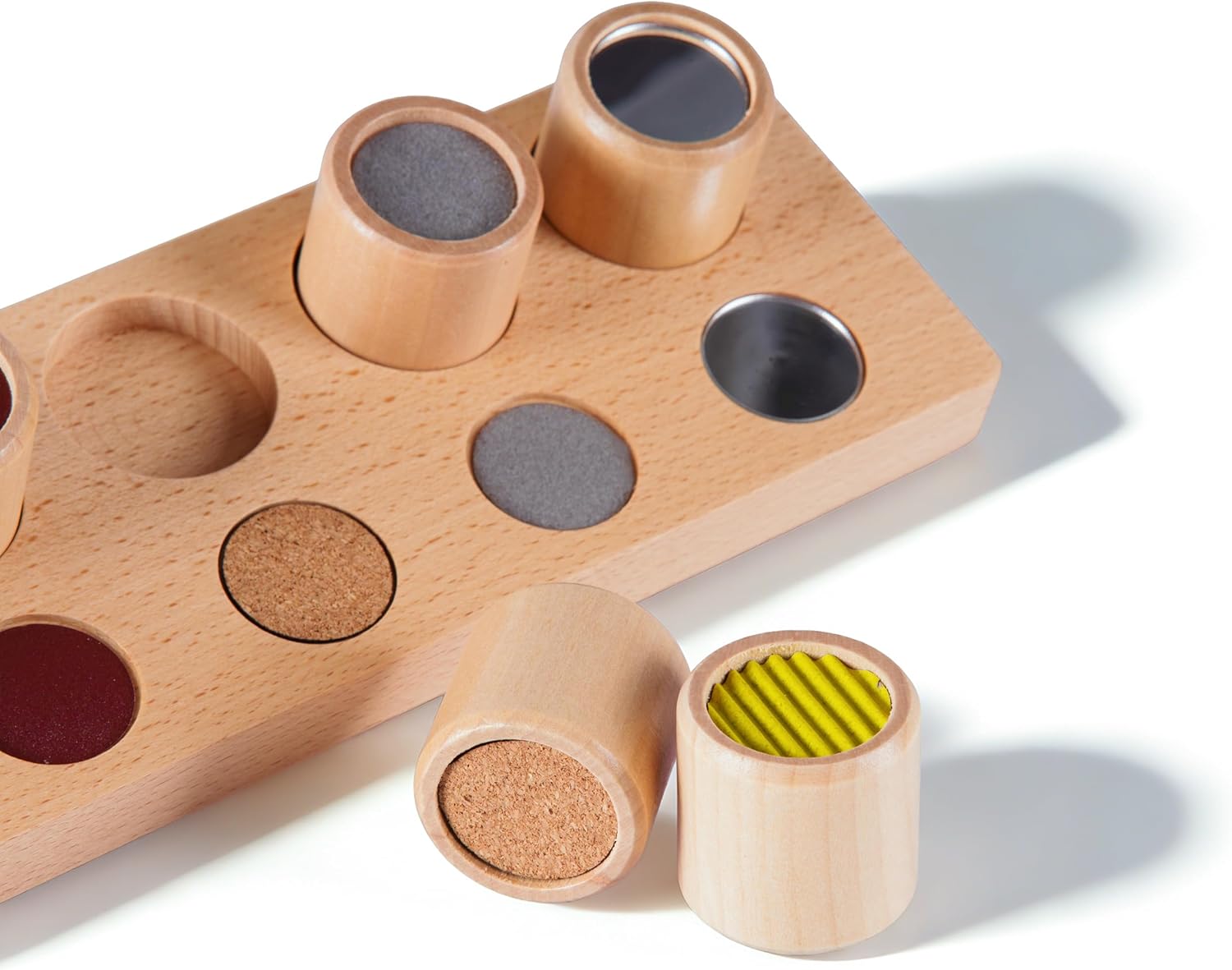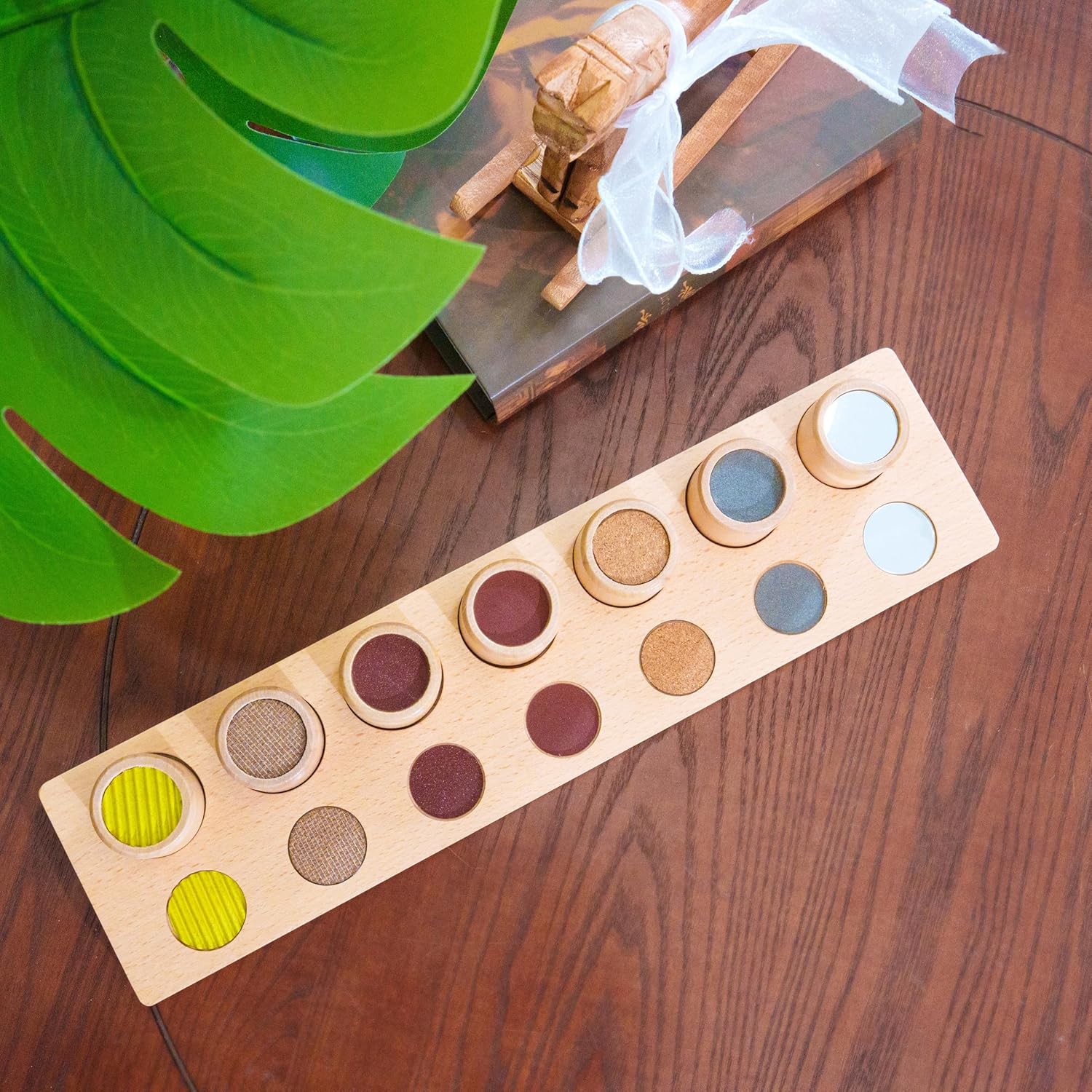 | Educational Objective | 1. Refine tactile discrimination โ distinguish subtle texture differences across seven graded surfaces., 2. Develop matching and classification skills โ foundational for mathematical and logical thinking., 3. Build fine motor control and hand-eye coordination through precise column placement., 4. Cultivate deep concentration and focused attention through purposeful sensory work., 5. Prepare the hand for writing by developing fingertip sensitivity and pincer grip. |