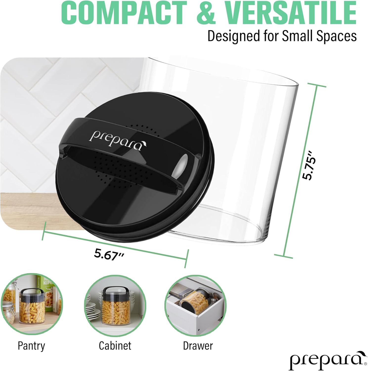 The Prepara Evak Fresh Saver Large Short 2-Pack with bold black handles delivers barista-level freshness in seconds. Each press triggers the patented Twin-Valve that forces oxygen out, sealing flavor and crunch inside these airtight containers. Crafted from crystal-clear plastic and cushioned by food-grade silicone, the jars are entirely BPA free. The base is top-rack dishwasher ready, while the handle pops off for a quick hand wash. Generous 5.75 × 5.67-inch dimensions swallow full bags of coffee or cereal, yet the large capacity allows stackable storage towers that slip neatly into kitchen pantry bins or stand tall on the counter. Versatility is the Evak advantage. Use them as brilliant fridge storage for chopped fruit, as dry-goods guardians beside the espresso machine, or as lunch-prep heroes keeping salads crisp until midday. The piston handle doubles as a scoop stop, so hands stay out and freshness stays in; the silicone gasket creates de-facto leakproof lids that tame soups or sauces. Pair this duo with other Evak sizes to build nesting containers that sort flour, sugar, nuts, and pasta by height and frequency, forging a zoned space saving organization system that makes cooking intuitive. From pantry to dishwasher, every seal is a small victory against waste and clutter—one press, one fresh bite, one more reason to love your kitchen.