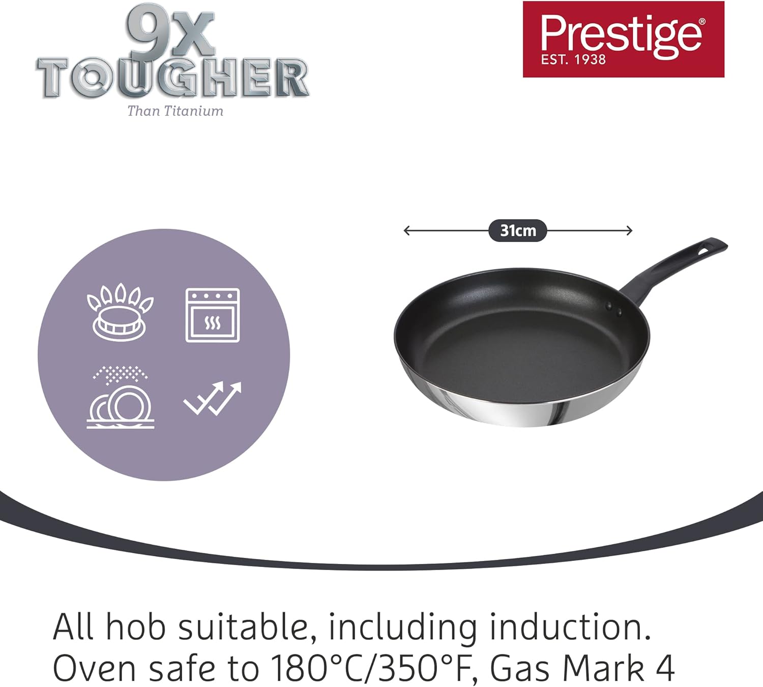 | Model Name | Prestige - 9x Tougher - Frying Pan - Stainless Steel - Non-Stick - Induction Suitable - Dishwasher and Oven Safe -31cm |