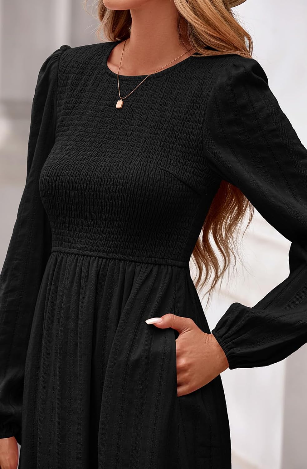 | Embellishment Feature | Crewneck Smocked Maxi Dress, Fall Wedding Guest Dresses for Women, Long Sleeve Fall Dresses, Long Sleeve Pleated Flowy Dresses, Smocked High Waist Long Dress |