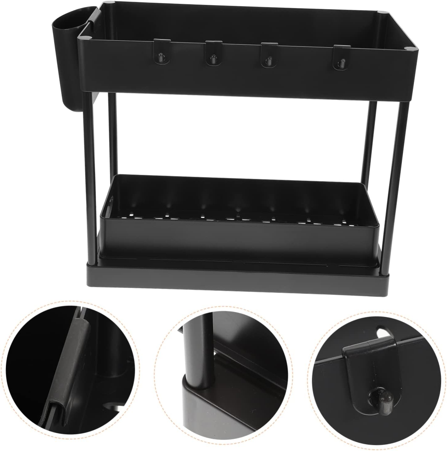 Package List 1 x storage rack 4 x hooks 1 x storage bucket Characteristics -Size:39.50X30.00X20.00cm/15.52X11.79X7.86in kitchen organizers -Color:Black under kitchen sink storage organiser -Material:ABS kitchen under sink organiser - The simple appearance and craftsmanship make the storage rack more unique kitchen sink storage organiser. - Create simple and elegant landscapes to your home kitchen, bedroom, bathroom, office, etc under the sink organizer. - With this storage holder, it can bring much convenience to your home under sink storage organiser. - Can store sundries, small items, towels, not worry about messy in the bathroom under sink organizer. - Simple and elegant, in line with people's aesthetics, bring much convenience to you organizer under kitchen sink.Goods Descriptionunder kitchen sink storage organiser Don't worry about a wobbly shelf, our storage rack will be sturdy and tough.kitchen organizers You can install this kitchen bathroom organizer easily, it can provide more space, very convenient and practical for kitchen and bathroom use, will be sturdy and stable for storage
