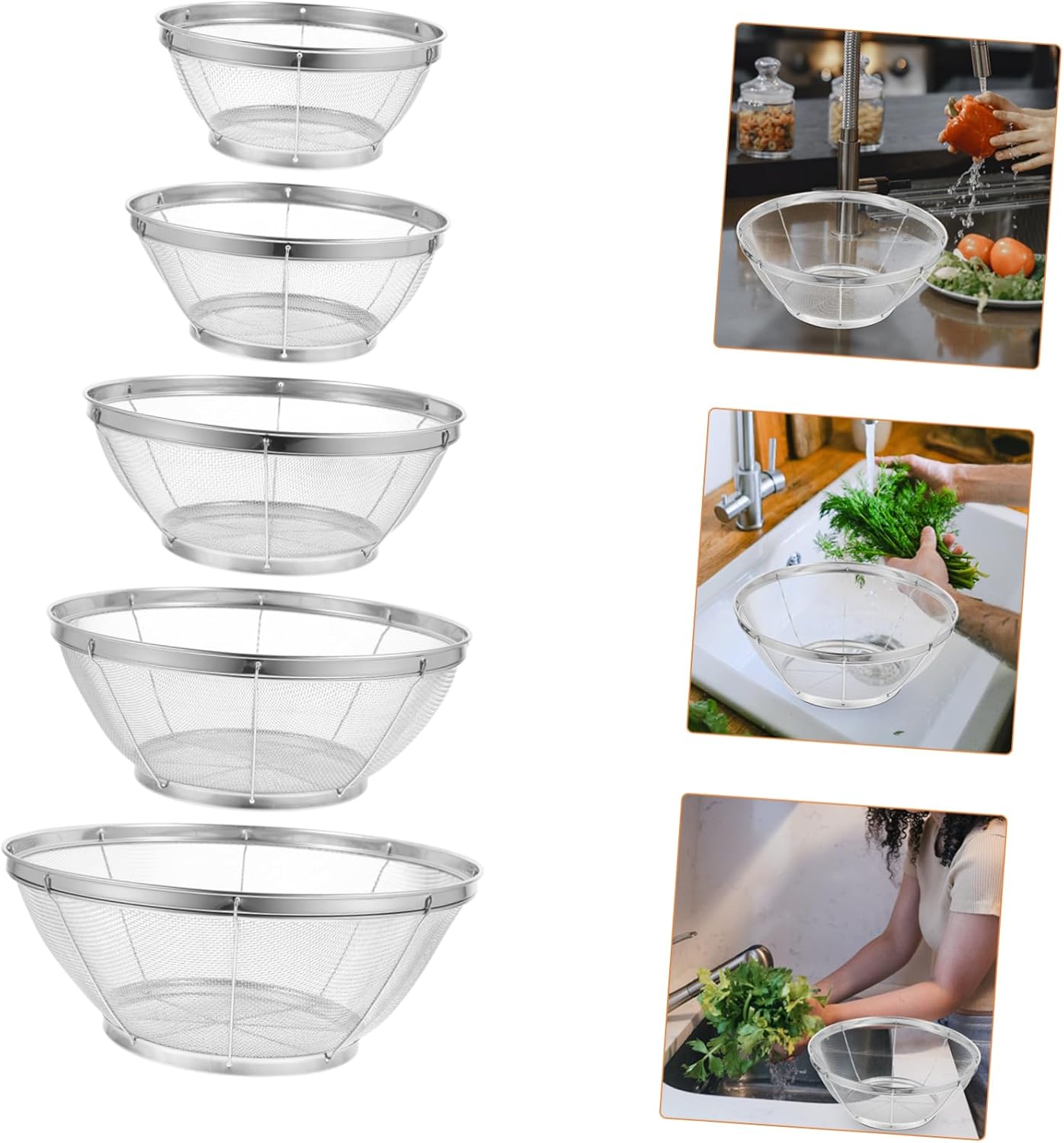 Package Include 1 x Colander Basket 18.5cm 1 x Colander Basket 21.5cm 1 x Colander Basket 24.5cm 1 x Colander Basket 27.5cm 1 x Colander Basket 30.7cm Characteristics -Size:30.70X30.70X12.00cm/12.07X12.07X4.72in Stainless Steel Mesh Basket -Size:21.80X21.80X8.50cm/8.57X8.57X3.34in Rice Strainer Container -Size:24.70X24.70X10.00cm/9.71X9.71X3.93in Strainer For Rice -Size:18.70X18.70X8.00cm/7.35X7.35X3.14in Rice -Size:27.50X27.50X11.00cm/10.81X10.81X4.32in Fruit Washing Basket -Color:Silver Drainage Basket -Material:Stainless steel Food Strainer Basket - This mesh strainer is simple and to use, convenient for daily use, and convenient for storage when not in use Stainless Wash Basket. - With its stackable design, this basket is a space-saving that can be easily stored when not in use Drainer For Cooking. - Fine workmanship, not easy to deform, convenient for indoor kitchen and outdoor camping use Mesh Strainer. - This multifunctional basket can also be used for storing a variety of household items, making it a versatile addition to any home Fruit Basin. - With this Drain Basket, it can filter out excess water from vegetables, very and convenient Convenient Colander.Goods DescriptionMesh Strainers For Kitchen With fine mesh design, it can be used as a rice drainage basket.Rice Washing Bowl This mesh strainer is made of stainless steel materials and is not easily broken, which .Fruit Basin Its drainage design allows water to drain quickly from the surface.Handheld Fruits Strainer This draining basket is very