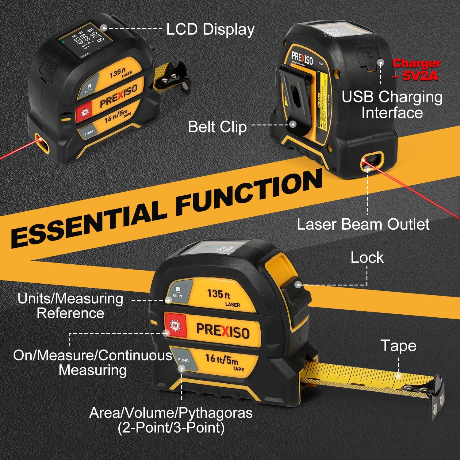PREXISO 2-in-1 Digital Tape Measure includes 1 x PREXISO 2-in-1 Digital Laser Tape Measure; 1 x Type C Charging Cable; 1 x User Manual; Auto-locking Tape & Magnetic Hook, backlit LCD screen for easy read; PREXISO 2-in-1 Digital Laser Tape Measure includes 1 x PREXISO 2-in-1 Digital Laser Tape Measure; 1 x Type C Charging Cable; 1 x User Manual; Class 2 laser, maximum laser output less than 1mW