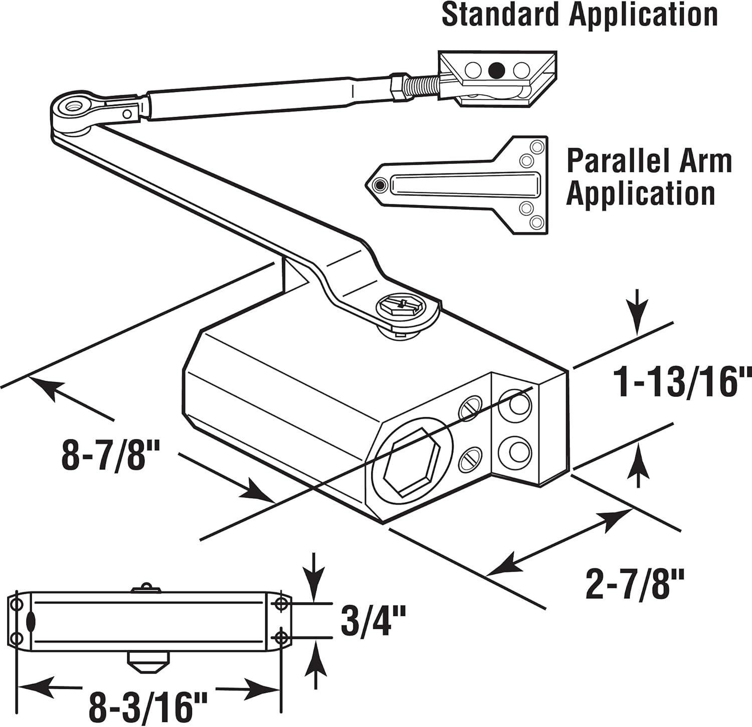 This non-handed, medium-duty hydraulic door closer is constructed of a cast aluminum body with an adjustable steel arm and it comes in an aluminum-colored painted finish. The closer features dual valves which control the closing and latching speeds of doors weighing from 80-140 lbs., it is U.L. listed, and it uses rack and pinion operation. This door closer can be mounted on most wood, metal and glass doors upon the door itself, or the frame header of both inswing or outswing doors without the need for any special adaptors. This hydraulic door closer is used to close opened doors to assist with indoor climate control and security measures.