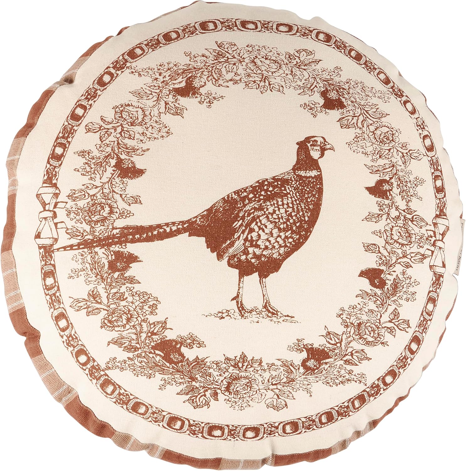 A decorative pillow from our Vintage Collection displaying a round shape and vintage pheasant design inspired by old world décor. Design features coordinating brown tartan on the gusset and brown velvet on the back. Our Pheasant pillow contains polyester filling and is shipped vacuum-sealed for protection and storage. Pillow includes zipper to remove and clean cover. A rustic home accent perfect for everyday use.