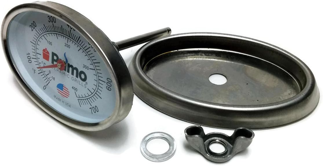 Primo part#200033. (This version includes the decorative bezel surround for the thermometer.) Replacement BBQ grill thermostat/temperature gauge for Primo ceramic grills. Newest model is now 200% larger in size for easy reading and is now able to be calibrated to ensure proper cooking temperatures. Replace or upgrade your existing thermostat to the latest and greatest style. Made in the USA. *Please note that some older Primo grills have a hole that is too small for the new probe to fit into. Primo recommends enlarging the hole using a 3/8" masonry drill bit. This does not effect your Primo warranty.