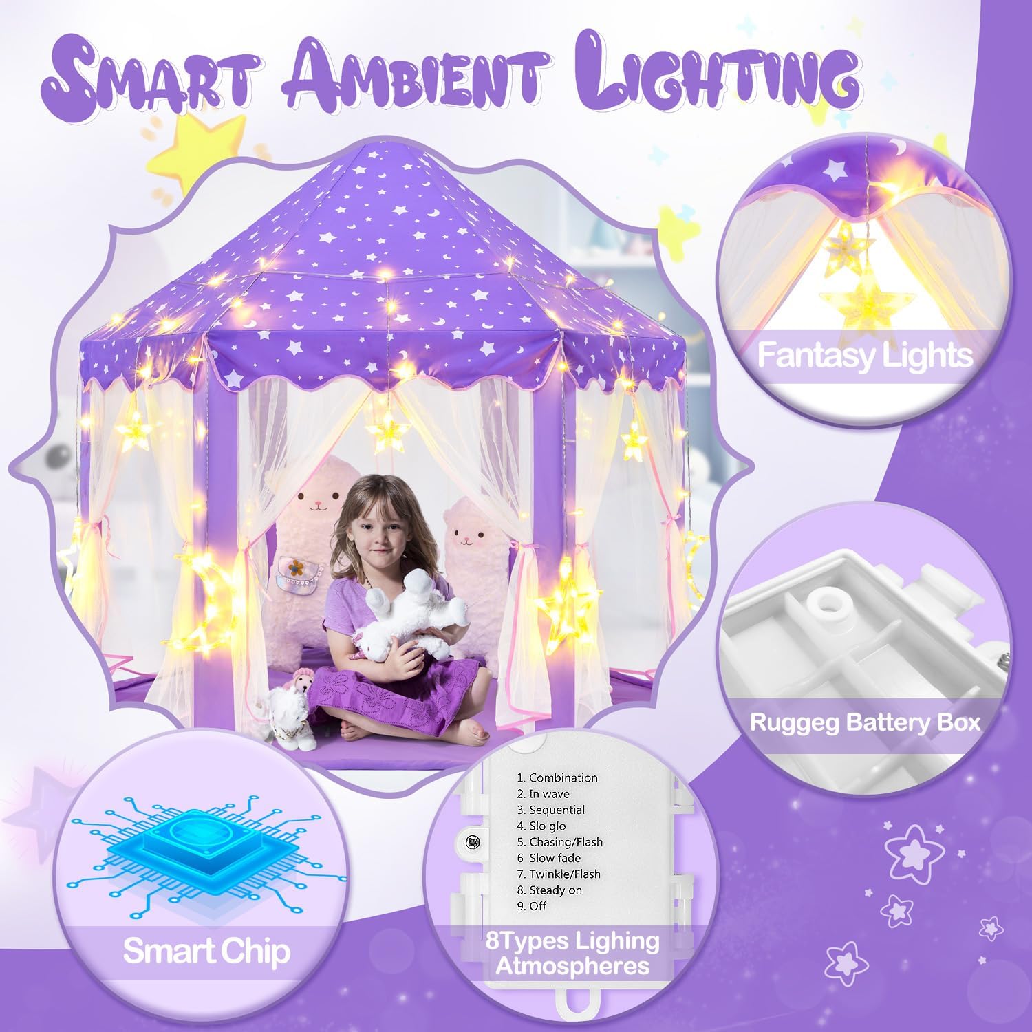 | Included Components | Assembly Manual, PVC Frame, Purple Fabric Princess Tent, Smart Big Star Light String |