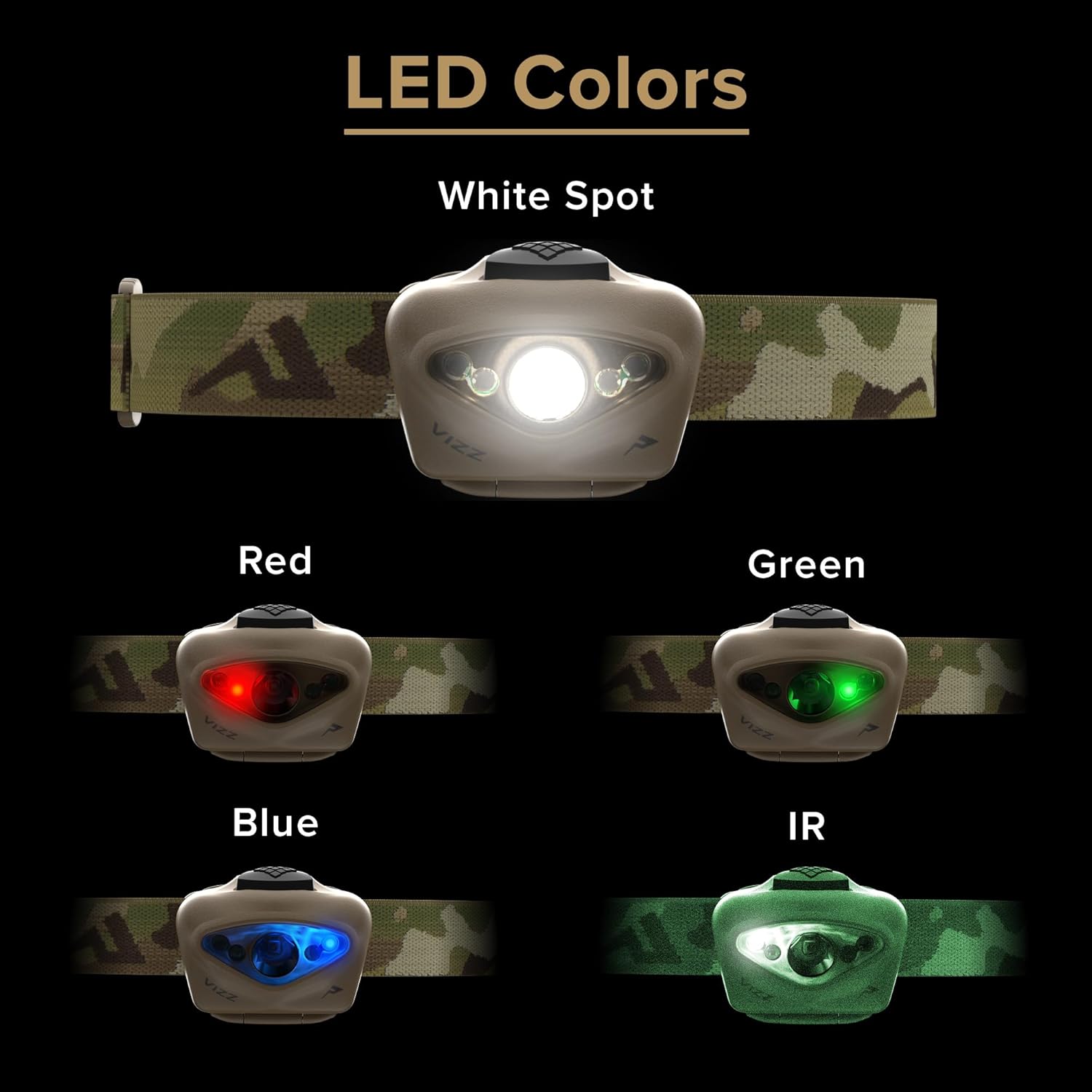 The powerhouse Vizz Tactical headlamp starts with a strong, white spot beam for long throw light. The main spot beam is also dimmable, providing easy to use close up lighting. The Vizz Tactical builds upon its versatility by adding red, blue, green and IR specialty colors, all available in the same headlamp. Set and change the order your specialty color LEDs appear in for a headlamp tailored specifically to your needs and preferences. All mode functions and customization processes are done with the large, easy to find push button at the top of the light. Durable body construction and a waterproof IPX7 rating round the Vizz Tactical out for a top-of-the-line choice in tactical lighting equipped to endure your next mission.