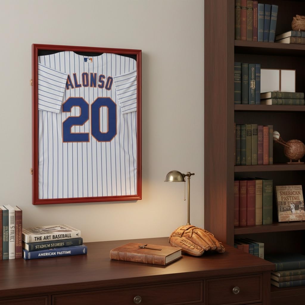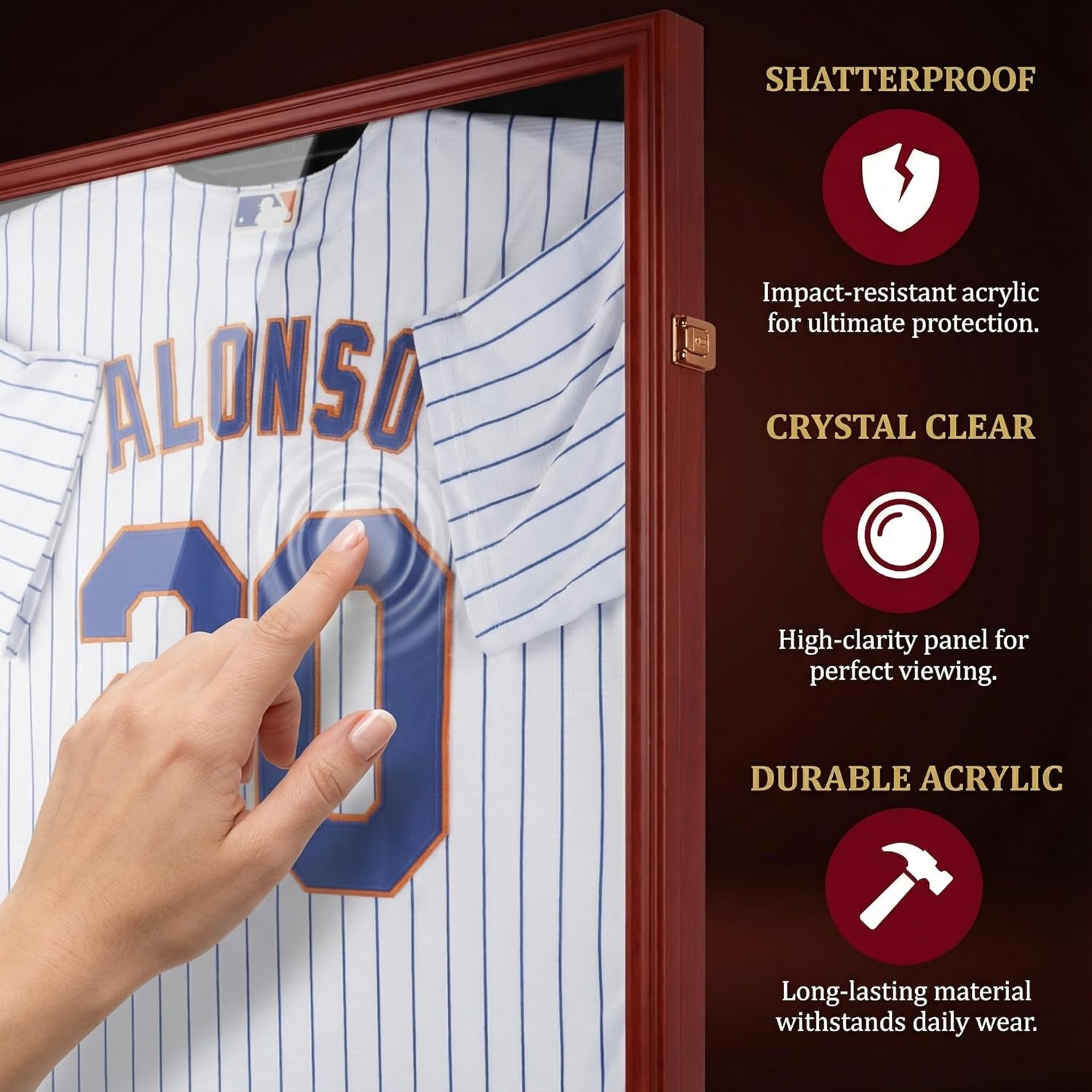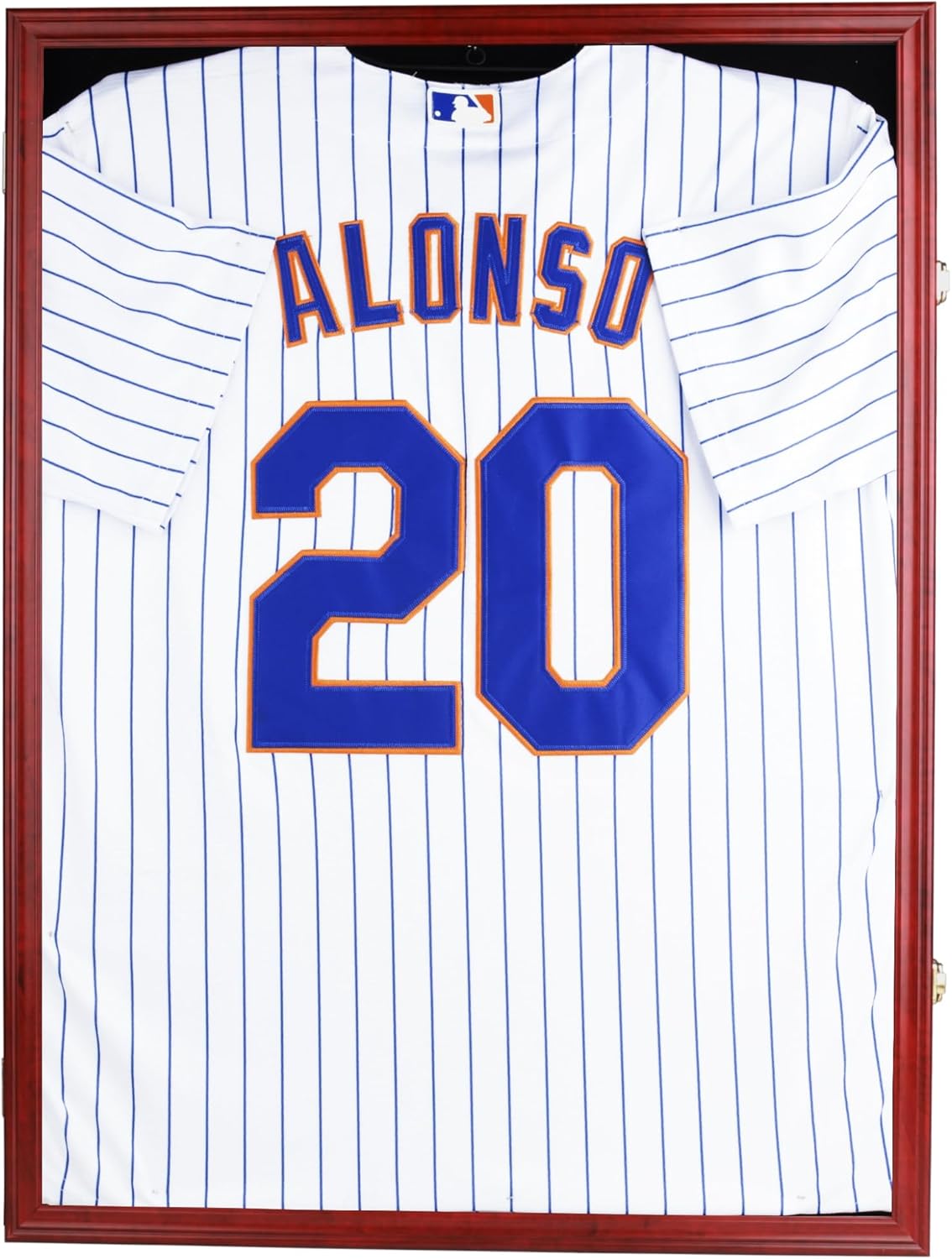 Solid wood frame hand crafted from our highly experience craftsmen with furniture grade beechwood. We are a well-respected provide for collector display cases with the traditional valued based price that is trusted in niche collector market. We don’t use Veneer just like most frame in the market. Here, on this listing is DisplayGifts Jersey Display Frame Case Large Frames Shadow Box Lockable with UV Protection for Baseball Basketball Football Soccer Hockey Sport Shirt. The frame provides two jersey mount options: The package comes with a pinboard, pins and a metal hanger. Use the pin board, for a tight and wrinkle free display, to mount your jersey pinned to desired form. Or, simply put the jersey on the metal hanger, and hang on the hook built in. Our visual instruction manual (included) walks you through both options. Mount the frame onto the wall using saw tooth hangers. Wall hooks on the wall also included. Product come assembled, it is easy set up in minutes! Classic pattern on the front of the frame. Just peel or the protective brown paper on the acrylic door and use. The item is well packed with protection material to make sure the jersey frame arrive safely to your door step. Dimensions:31.25" H X 23.25" W X 1.5"D Interior Dimension: 30.5"H X 22.5"W X 1"D.