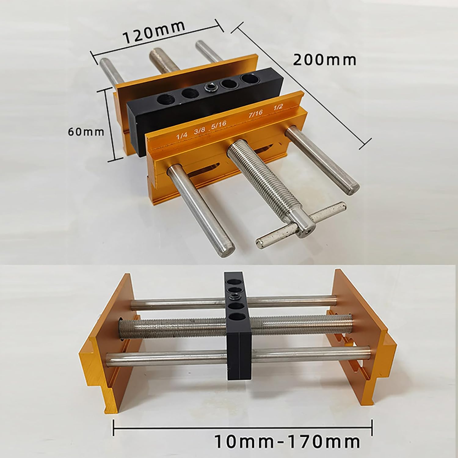 Professional Centering Dowelling Jig Wood Dowel Hole Drilling Guide Woodworking Positioner Locator WoodworkingFeatures:5 standard drill bit sizes, namely 1/4", 3/8", 5/16", 7/16" and 1/2"; allow you to easily apply it to mortise and joints, build furniture and repair tables, making for planking.There are 4 holes on the top of the clamp, 2 of which can be installed with threaded bushings, which can be replaced with 1/4", 3/8" and 5/16", and the other 2 holes can be installed with 7/16" and 1/2" drill bits, making tool for various woodworking projects.Make closet shelves that require flat panel connection, make shelves, cabinets, desks, breakfast tables, shutters in the garage, repair doors that were accidentally damaged by children, make floating shelves, install railings.The engraved lines seen on the front are used for direct center alignment. Alignment can be done visually, and when the middle bolts is turned, the aluminum clamps on both sides will be tightened at the same time, and the plate will be clamped evenly so that the position to be perforated is in the exact center.The aluminum surfaceS is anodized and is not easy to leave scratches. The screws rust and are more stable.Specifications:Component:AluminumType:inch/MetricSize:Approx.12x6.5cm/4.72x2.56inchPackage Includes:1Pc Dowel Jig6cs Drilling BushingNote:1.Please allow 1-2cm errors due to manual measurement, making sure that you not mind before order. 2.Due to the differences between different monitors, the picture may not reflect the actual of the item.