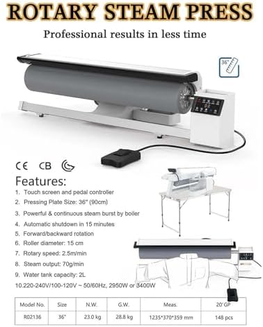 Introducing the Commercial Drum Iron, the ultimate solution for efficient ironing in both professional and home settings. Designed with convenience in mind, this advanced ironing machine features dual control options: a user-friendly touch screen and a handy foot switch. This innovative design allows for seamless operation, giving you the flexibility to tackle various fabrics effortlessly. With a substantial 90 cm drum length and a unique forward and reverse rolling mechanism, this drum iron ensures thorough coverage and exceptional results. The rolling speed of 2.5 m/min accelerates the ironing process, making it perfect for high-volume tasks. The generous 2-liter water tank provides a powerful steam output of 70 g/min, guaranteeing crisp, wrinkle-free garments every time. Whether you're a tailor, a dry cleaner, or simply someone who values perfectly pressed clothing, this drum iron adapts to your needs. Its 14 cm drum diameter is suitable for a wide range of fabric types, from delicate silks to heavy cottons. The sleek white design adds a modern touch to your workspace, while the compact dimensions of 123.5 x 37 x 35.9 cm ensure it fits seamlessly into your setup. Included with your purchase are the rotary iron steam machine, a measuring cup for precise water measurements, and an easy-to-follow instruction manual. Elevate your ironing experience with the Commercial Drum Iron, where efficiency meets quality for impeccable results every time.