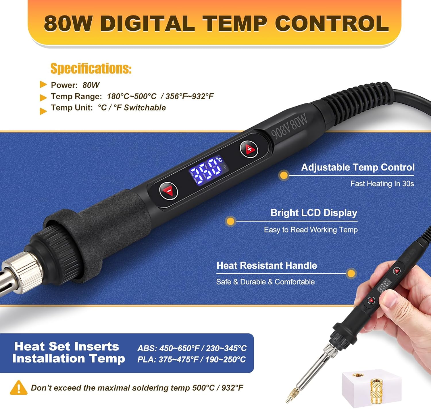 Transform 3D Prints with Professional-Grade Threads! Upgrade from fragile plastic threads to industrial-strength metal inserts! Our Heat Insert Tool Kit combines an 80W digital soldering iron, precision heat set insert tips, and 520 brass inserts – everything you need to reinforce 3D printed parts in one box. Why This Soldering Iron Heat Set Insert Tool Dominates: Pro Control: LED temperature display prevents plastic damage. Full Compatibility: Tips for M2-M8 covers 99% of applications (drones, RC, furniture). Brass Superiority: Inserts last 10x longer than plastic threads. Zero-Waste Organization: Case keeps all heat set insert tips and inserts instantly accessible. Engineered For: High-stress assemblies (motor mounts, bearing blocks) Carbon fiber/nylon composites Prototypes requiring repeated disassembly Kit Includes: 80W Soldering Iron Heat Set Insert Tool (110V) 7 Heat Set Insert Tips :M2 M2.5 M3 M4 M5 M6 M8 520 Brass Inserts (M2/M3/M4/M5) Flux pen & compartment case Backed by Kadrick’s Decade of Hardware Excellence – Order Risk-Free Today!