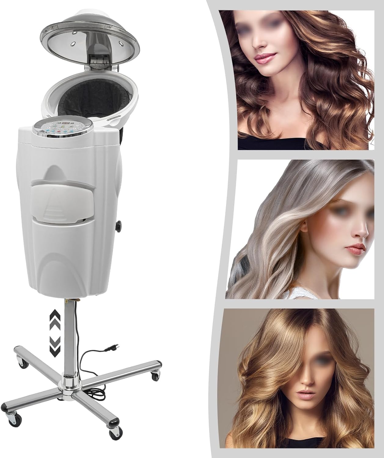 ApplicationThe product is suitable for professional hairdressers or personal use in homes, spas, hairdressing salons, barber shops, and beauty salons.SpecificationsColor: WhiteStyle: ModernMaterial: ABS, IronProcess: ElectroplatedAssembly Required: YesMount Type: Free StandingPower Source: Corded Electric Plug Type: US StandardWater Type: Purified WaterNumber of Light Colors: 12 Timing Range: 0-99minTemperature Adjustment Range: 40-70℃/104-158℉Mist Spraying and Cold Wind Level: 4 Voltage: 110VPower: 700WWater Tank Capacity: Approx. 2L/67.63ozWaste Water Bottle Capacity: Approx. 350ml/11.83ozBase Length: 74cm/29.13inProduct Height: 140-167cm/55.12-65.75inPackaging Size: 128*50*43cm/50.39*19.69*16.93inGross Weight: 21kg/46.3lbsNet Weight: 19kg/41.89lbsNotes1. Please check the size carefully before ordering.2. It is recommended to use purified water rather than tap water to avoid damaging the machine.3. Please read the operating manual and label completely before use, and pay particular attention to the safety instructions included.4. Please allow the slight color difference caused by the shooting light and 1-3cm error due to manual measurement, and make sure you do not mind before you order.