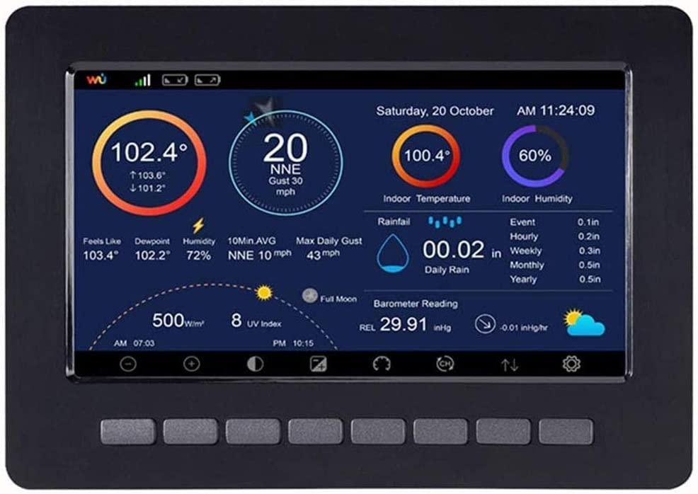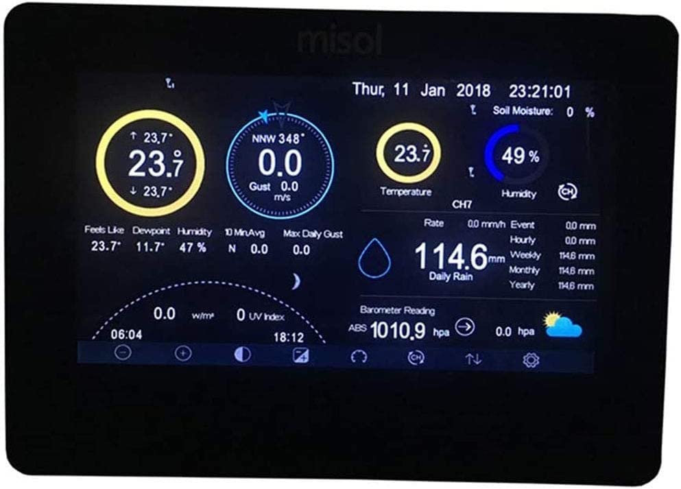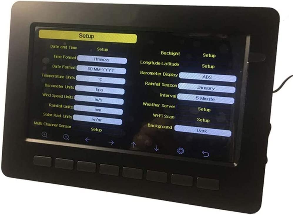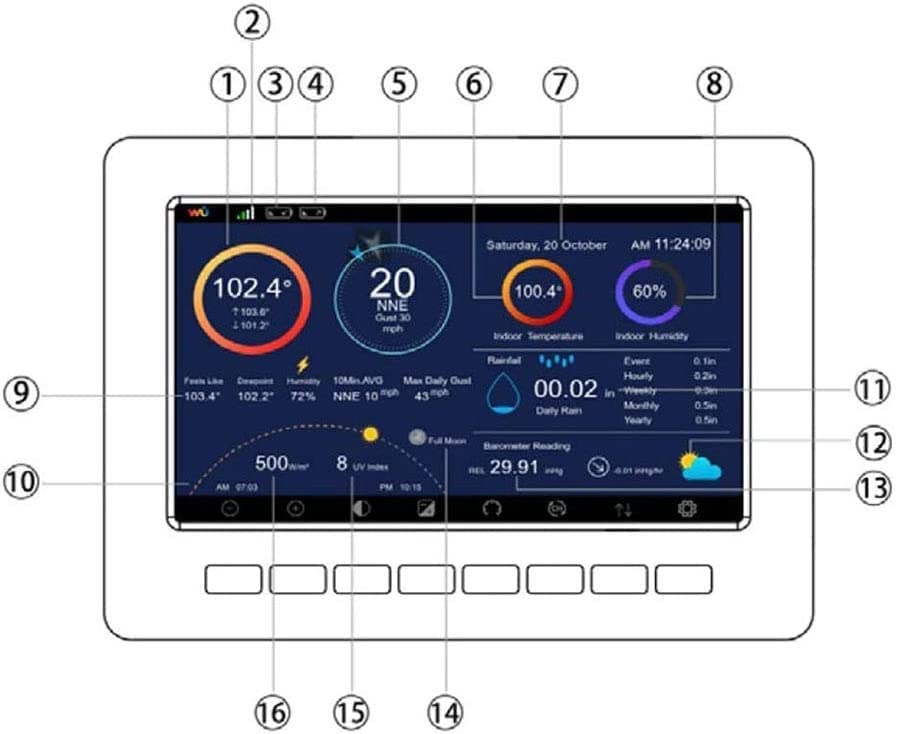 Feature:Professional weather station can measure indoor and outdoor temperature, humidity, air pressure, wind speed, wind direction, precipitation, UVI, etc.Product parameters:Outdoor temperature sensorWireless signal transmission frequency: 433MHzWireless signal transmission distance: up to 100M (330 feet)Outdoor temperature range: -30℃~+60℃ (resolution: 0.1℃, error: +/- 1℃)Humidity range: 1% to 99% (resolution: 1%, accuracy: +/- 5%)Rainfall display range: 0~6000mm (resolution: 1mm, accuracy: +/- 10%)Wind speed display: 0~50m/s (resolution: 0.1m/s,)Wind direction: 0-359°Illumination: 0-120k Lux, error: ±15%UV index: 0-15Alarm time: 120 secondsData transmission frequency: 16 secondsData storage frequency: 1 minute ~ 240 minutes to save once (frequency can be adjusted by yourself)Solar energy (without charging the battery)Indoor receiverIndoor temperature range: 0°C-+ 60°C (resolution: 0.1°C, error: +/- 1°C)Humidity range: 10%~99% (resolution: 1%, accuracy: +/- 5%)Air pressure (measurement range): 300-1100hPa, resolution: 0.1hPa, accuracy: +/- 3 HPA (interval of 700-1100hpa)Indoor sensor measurement interval: 60 secondsBattery: AA 1.5V battery (not included)Waterproof rating: IPX3