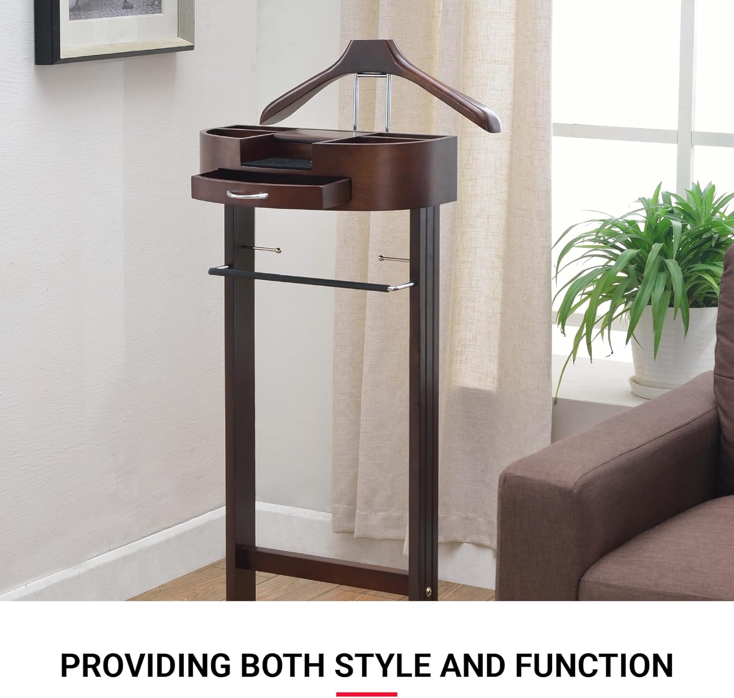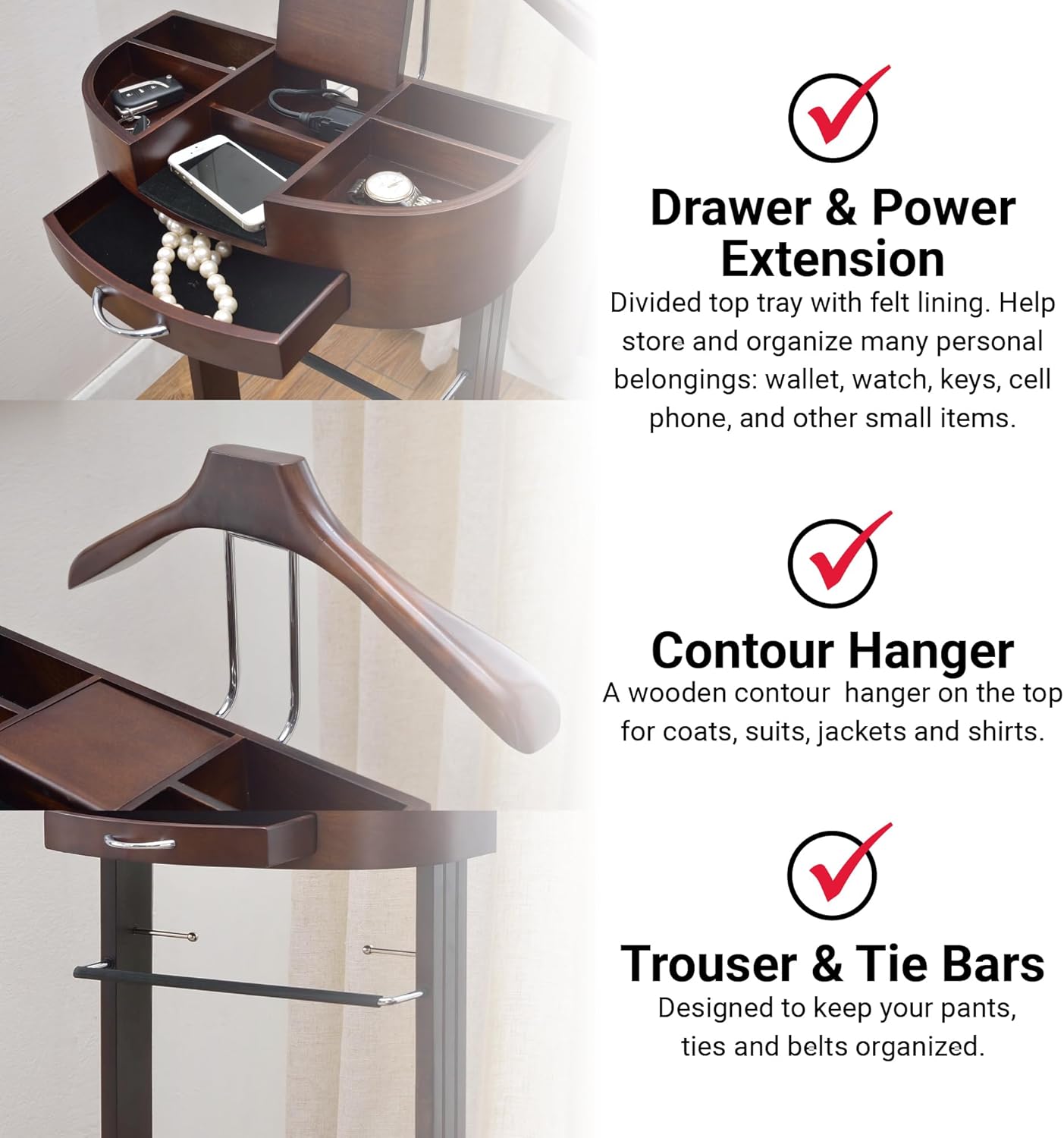 With a contemporary aesthetic and design, this convenient valet is perfect in your bedroom, office or entryway for easy access to your clothes, accessories and essentials. Ensure your clothes are wrinkle-free by placing them on the hanger. In addition to garments, place ties, scarves and more on the handy hooks. Your wallet, keys and other essentials can go on the divided tray. Delicate items or jewelry fit nicely in the felt-lined compartments. The large storage drawer is ideal for storing miscellaneous items. Charge your electronics with the included power extension cord. The high-quality wood and materials make sure this valet is built to last. At Proman Products, we’re committed to transforming your space with unique and innovative solutions. From space-saving products that simplify your life in ways you never imagined to contemporary updates of classic items like room dividers, we’re here to make your space not just more appealing, but truly comfortable. You can enjoy our valets, storage organizers, shelves and room dividers for life, because we care about premium quality materials that are built to last.