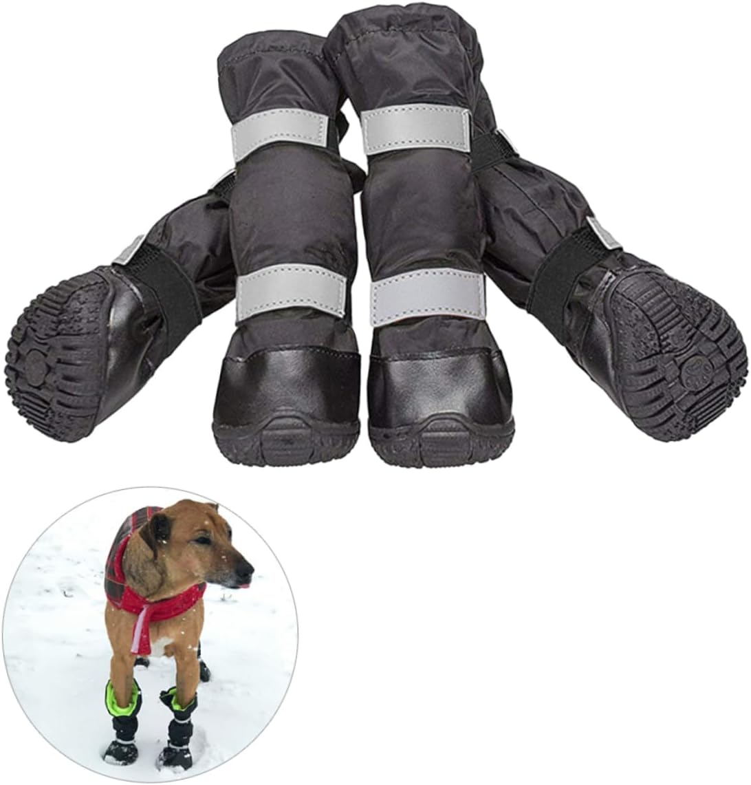 Package List 4 x Snow Boots Characteristics - SizeL: 8x7x22cm dog shoes. - SizeS: 6x5.3x16cm Pet dog shoes. - SizeM: 7x6.2x19cm boots for dogs. - Material: Rubber. - SizeXS: 5.5x4.9x15cm. - SizeXL: 9x8x24cm. - Can well protect your dog's paws from jagged stones, sand, snow or any abrasive surface, and keep their paws dry, clean, warm and comfortable dog boots. - Simple and casual design, easy to put on and take off shoes for dogs. - Designed as dog hiking boots, dog running shoes or general dog sports shoes for simply walking outside Pet Shoes. - Suitable for most pet dog and puppies to wear. - ColorBlack - Tough -slip soles design, for all-weather use. - Adopts adjustable adhesive snap closure secure fit.Goods Informationdog boots Easy to wear, it is really a must-have for your lovely pet dogs.shoes for dogs The item is a set of 4pcs simple and dog shoes, which is mainly made of materials and and adopts durable -slip rubber shoe soles, and can well protect your pet dog's paws from jagged stones, sand, snow or any abrasive surface and keep their paws dry, clean when walking outside