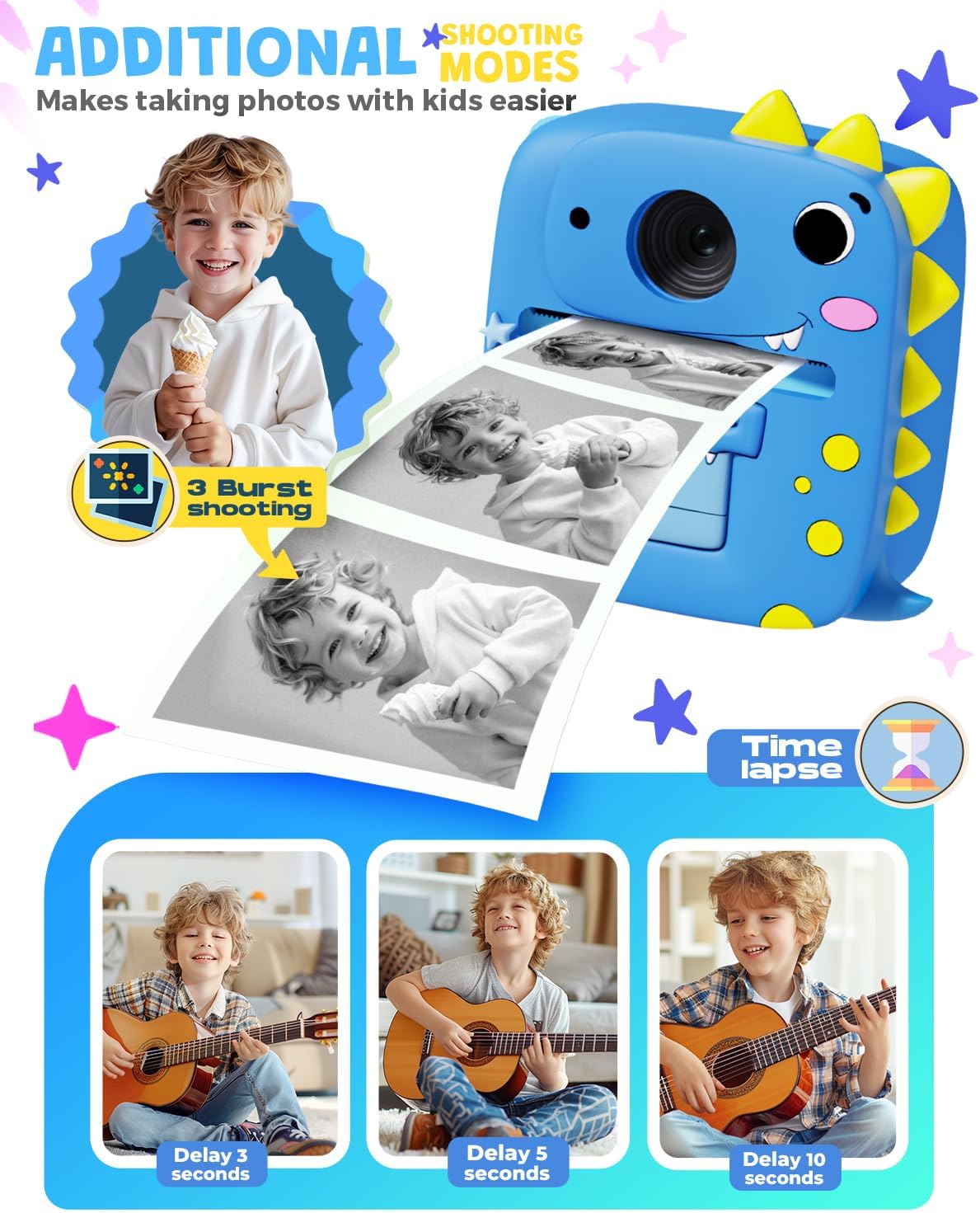 If you are struggling to pick a suitable camera or gift for your child, then you can choose the Pussan Instant Print Kids Camera.Pussan Kids Camera Instant Print brings a wonderful childhood to your child, it inspires a strong desire to explore the world and can be photographed to record the beautiful images of the time! There is also the option to print them out and organise them into a childhood photo album.This camera is a multi-functional kids' camera that combines printing and photographing in one, with lots of features inside for your child to explore. In addition to taking photos and printing, children can use the paintbrush to DIY their own photos, download music in MP3 format to the memory card, and have 4 built-in games: Block Puzzle, Push the Box, Power Bouncer and Snake. It can also print some paper games using the print function. However, you will need to prepare your own pen (which is not included in the package).Packing List:1 x Kids Print Camera3 x Print paper roll1 x 32G SD card (pre-inserted)1 x Type C cable1 x Lanyard1 x Manual