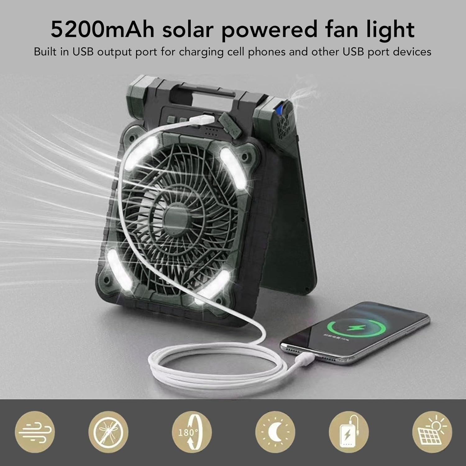 1. SOLAR AND TYPE C CHARGING: You can charge it with the 3.8W high efficiency monocrystalline solar panel during outdoor adventures such as camping, fishing, and hiking. Not only can you charge with solar power, but indoors you have the option of Type C charging. 2. 4 ADJUSTABLE SPEEDS: It utilizes an advanced brushless motor that works to improve efficiency and durability. With 4 adjustable speed function, it gives you a personalized cooling experience. You can experience a maximum air speed of up to 4.5m/s. Ultra thin fan blades ensure superior airflow with minimal noise (3. MULTIFUNCTIONAL: Our fan comes with a 5200MAH battery and can enjoy up to 18 hours of wind on the lowest setting and 8 hours on the highest setting. Featuring a indicator light design that reminds you to charge on time. In addition to cooling, this fan can be used as a power bank with two charging ports (input and output) to charge smartphones, laptops, and outdoor essentials. 4. THREE BRIGHTNESS LEVELS AND TIMER SETTINGS: This fan features three adjustable brightness settings and a super bright LED camping light with 16 beads. It also has a timer function that you can set to automatically turn off after 2, 4 or 6 hours depending on your preference. This not only saves power, but also ensures a calm night's sleep. 5. STURDY AND DURABLE: Our solar fan is made of premium ABS and metal material, which has strong durability and can be used for a long time, coping with various outdoor environments with ease. Spec: Item Type: Solar Fan Material: ABS, Metal Weight: Approx. 1024g / 36.1oz Battery Type: Lithium Battery, 5200MAH (Built In) Product Size: Approx. 17.5x7.5x23cm / 6.9x3.0x9.1in packing list: 1 xSolar Fan 1 x Instruction Manual 1 x USB Cable