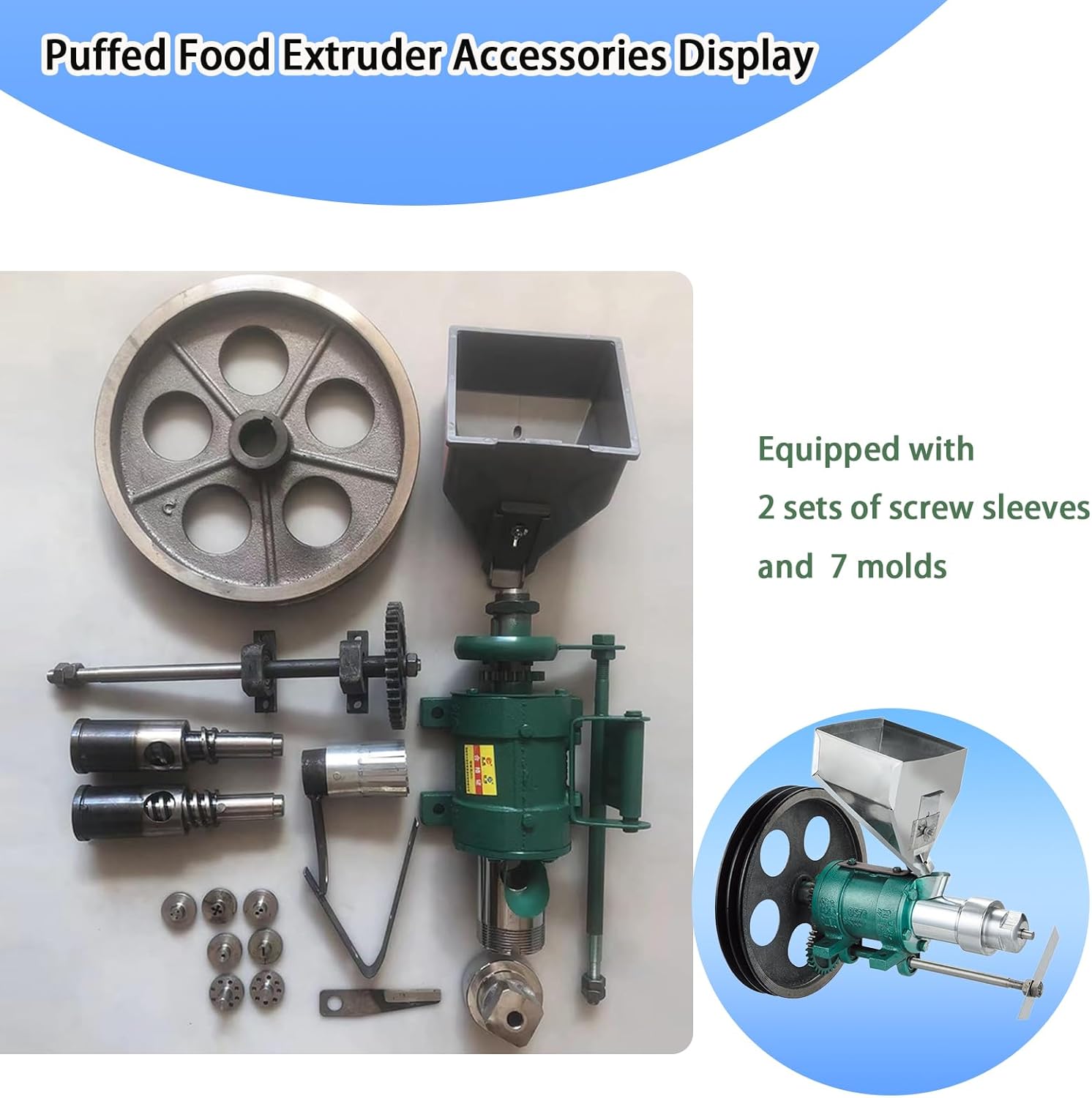 - **Type:** Puffing Food Extruder- **Material:** Cast Iron, Stainless Steel, Plastic- **Color:** Available in black, green, red, and orange, shipped based on batch availability- **New Upgrades:** - Sturdy plastic hopper with large capacity and resistance to deformation - Plastic bearing that is resistant to rust- **Production Capacity:** 20-25 kg/hour- **Rotation Speed:** 450-500 r/min- **Suitable Ingredients:** Rice and corn**Note:** This product does not include a motor, belt, or tools. Please ensure you have an electric motor or diesel engine before purchasing.**Supporting Power Requirements:**1. **Diesel Engine:** 12 horsepower with a pulley diameter ranging from 3.5 inches to 5.51 inches2. **Electric Motor:** 220V 380V with a power output of 4000-5500W3. **Gasoline Engine:** 15 horsepower or greater**Package Includes:**- 1 x Multifunction Puffing Food Extruder Machine- A set of molds (7 pieces)**Important Considerations:**1. **Sweetening:** Avoid using sugar to stir rice or corn; instead, opt for saccharin or suitable alternative sweeteners for the desired level of sweetness. 2. **Maintenance:** After processing, allow the machine to idle for 15-30 seconds to burn off residual rice, then turn off the power. Remember to wear gloves when handling the machine and use tools to remove the head nut for clearing remnants. 3. **Craftsmanship Notice:** As most food machinery products are handmade and welded, some minor imperfections, such as scratches, discoloration, or rust spots, may be present. These do not affect functionality.