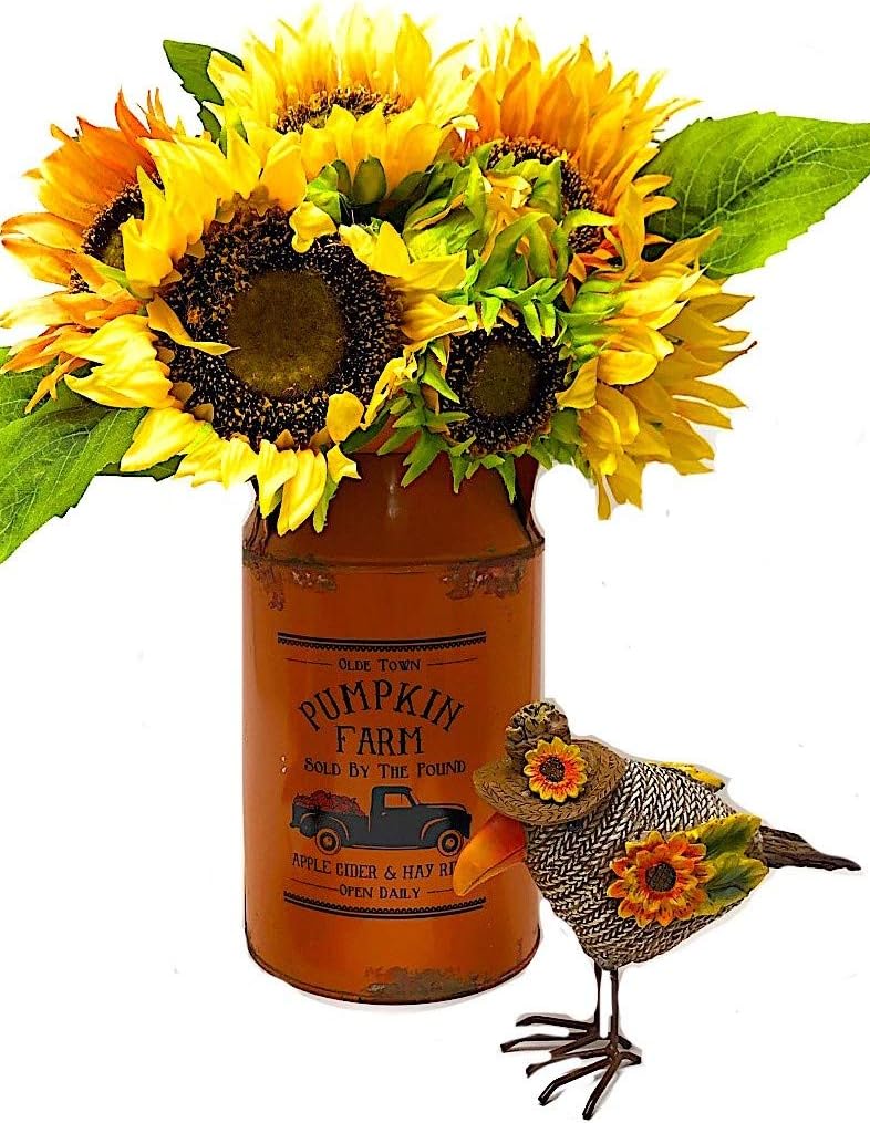 Decorative metal milk can water can planter vase for home or office business use decor. Made of tin galvanized metal with rustic orange and black letterings, complete with Pumpkin Patch writing and an image of Antique Truck in the front. Use it as seasonal decor in the kitchen, living room, or bedroom. It can also be used as a planter to store artificial, fake plants, greens, and flowers. Gift for self or someone special during the fall, harvest, or Thanksgiving seasons. Farmhouse, country house living inspired piece. Measures approximately 9" H x 5" W. Opening at the top is approximately 3" in diameter. Not suitable for food storage. Decorative use only.