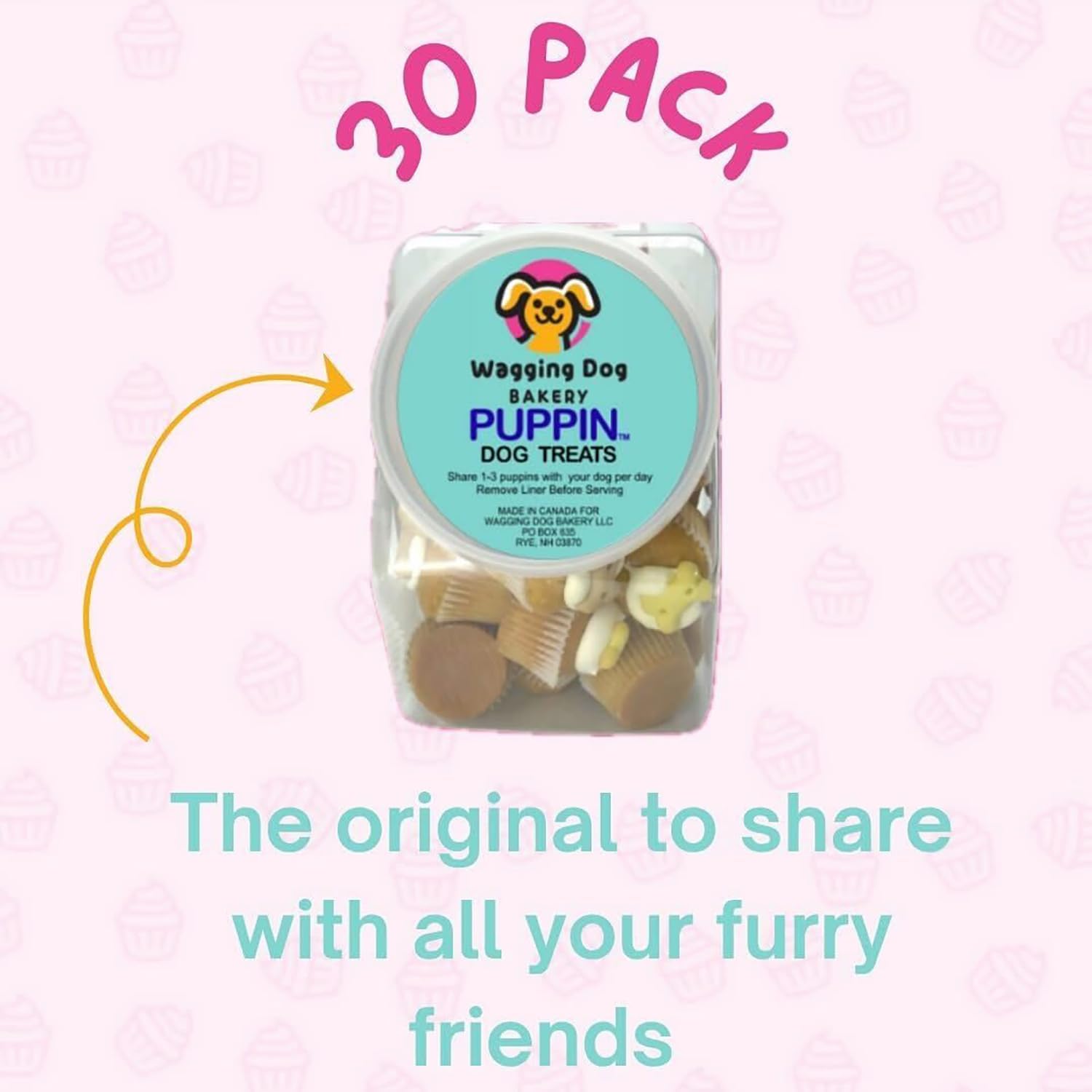 "WAGGING DOG BAKERY'S PUPPIN MINI CUPCAKE DOG TREAT - 30 PACK WITH COUNTERTOP DISPLAY JAR - At Wagging Dog Bakery, we are passionate about creating quality, nutritious treats that support the health and happiness of your furry companions. Our mission is rooted in the belief that dogs deserve the same care and quality in their snacks as we do in our own food. That’s why we use only natural, wholesome ingredients to craft delicious, tail-wagging goodies. Our Puppin Mini Cupcakes are a perfect example of this commitment. Specially developed just for dogs, these adorable treats are made entirely with human-safe ingredients, ensuring both safety and taste in every bite. Crunchy biscuity texture, flavorful, and fun-sized - Puppin Mini Cupcakes are the ideal way to celebrate your pup. Whether it’s a special occasion or just a moment to show some extra love. With Puppin’s, every treat time becomes a joyful experience you and your dog can feel good about. Wagging Dog Bakery – where the treats are tail-wagging tasty! INGREDIENTS: Canola Oil (preserved with BHA and BHT), Dextrose, Oatmeal, Rye Flour, Dried Egg, Water, Dried Yogurt Powder, Sugar, Maltodextrin, Dried Whey, Glucose, Baking Powder, Mono- and Diglycerides of Edible Fats, Citric Acid (a preservative), Potassium Sorbate (a preservative), Potato Starch. GUARANTEED ANALYSIS: Protein (Min) 7%. Fat (Min) 16%. Fiber (Max) 1%. Moisture (Max) 19%. CALORIES PER PUPPIN: 54."