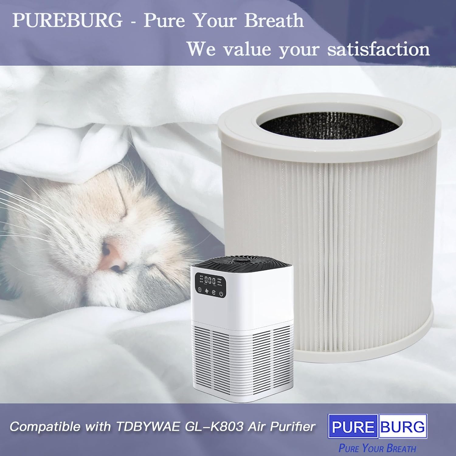 PUREBURG Replacement Filters Compatible with TDBYWAE GL-K803 Air Purifier ,3-Pack H13 True HEPA Activated Carbon 3-Stage Filtration Air Clean Dust VOCs Odor Disclaimer: This product is a generic item that is designed to replace the original part. Any brand names or logos are the registered trademarks of their respective owners. Any use of any brand name or model designation for this product is made solely for purposes of demonstrating compatibility. . PUREBURG - Pure Your Breath! We value your satisfaction. If you have any problems using our product, please always contact us.