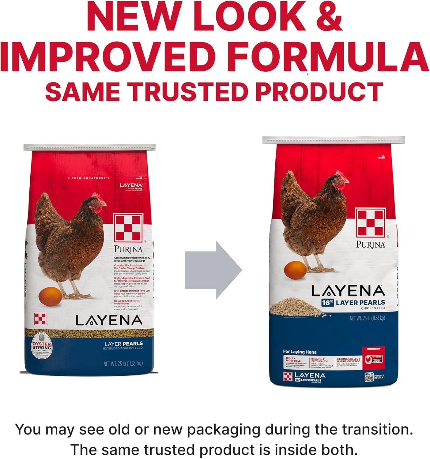 Purina Layena Pearls chicken feed is made for hens who are at least 18 weeks old and laying eggs. This layer feed has all the nutrients your chickens need, so you don't have to add any supplements. This 16% protein chicken feed supports hens' health and keeps them laying nutritious eggs. It contains oyster shells, Vitamin D, and manganese to support stronger eggshells. This chicken feed also contains prebiotics and probiotics for immune and gut health. Plus, there's marigold extract in the feed for rich, vibrant egg yolks. Purina Layena chicken layer feed is available in crumbles, pellets, or pearls. Crumbles, pellets, and pearls provide the same high quality nutrition. The choice between the three is a matter of personal preference. The unique bite-size pearls reduce feed waste while providing essential nutrients. You put everything into raising your chickens and want what's best for them. So do we. Our passion pushes us every day, out on the farm, to innovate and deliver the best nutrition for the best outcomes. Together, we can support the performance, productivity and wellbeing of every animal.
