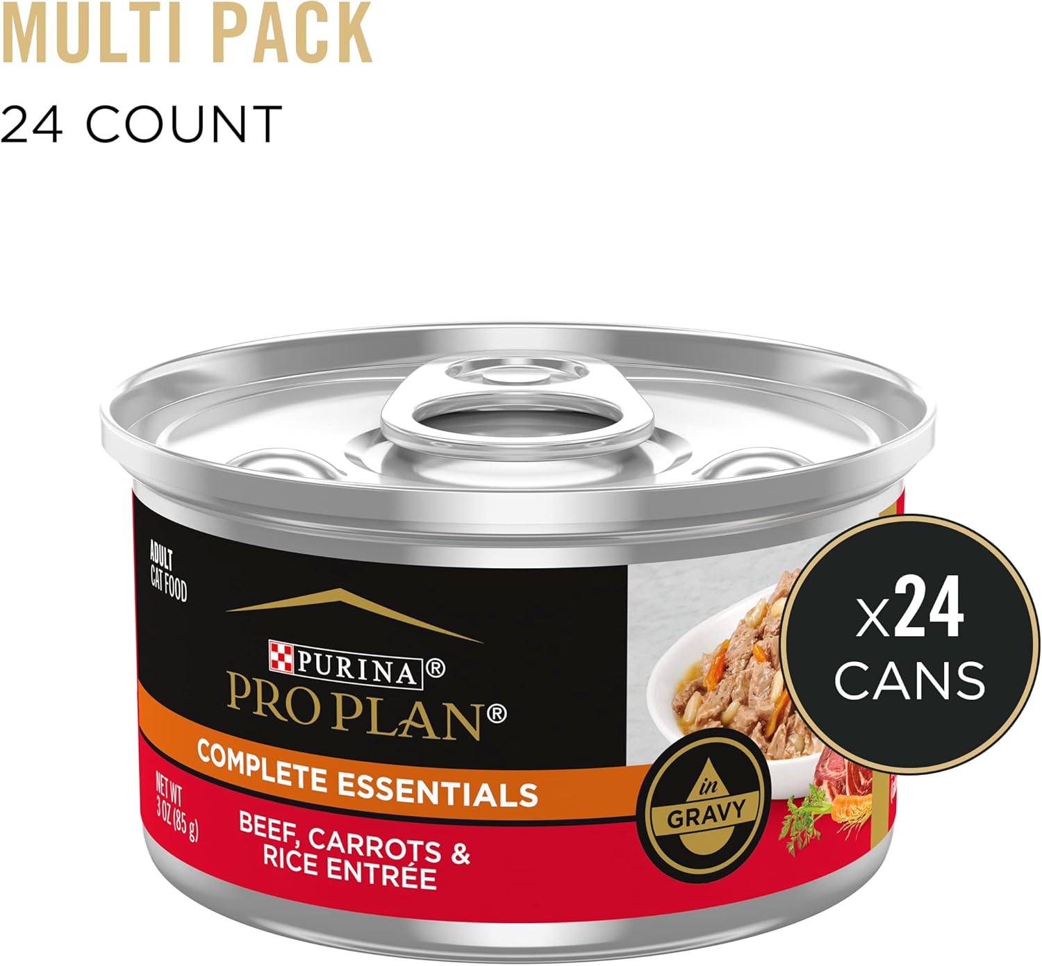 | Included Components | Twenty-Four (24) 3 oz. Pull-Top Cans - Purina Pro Plan Gravy, High Protein Wet Cat Food, COMPLETE ESSENTIALS Beef, Carrots & Rice Entree |