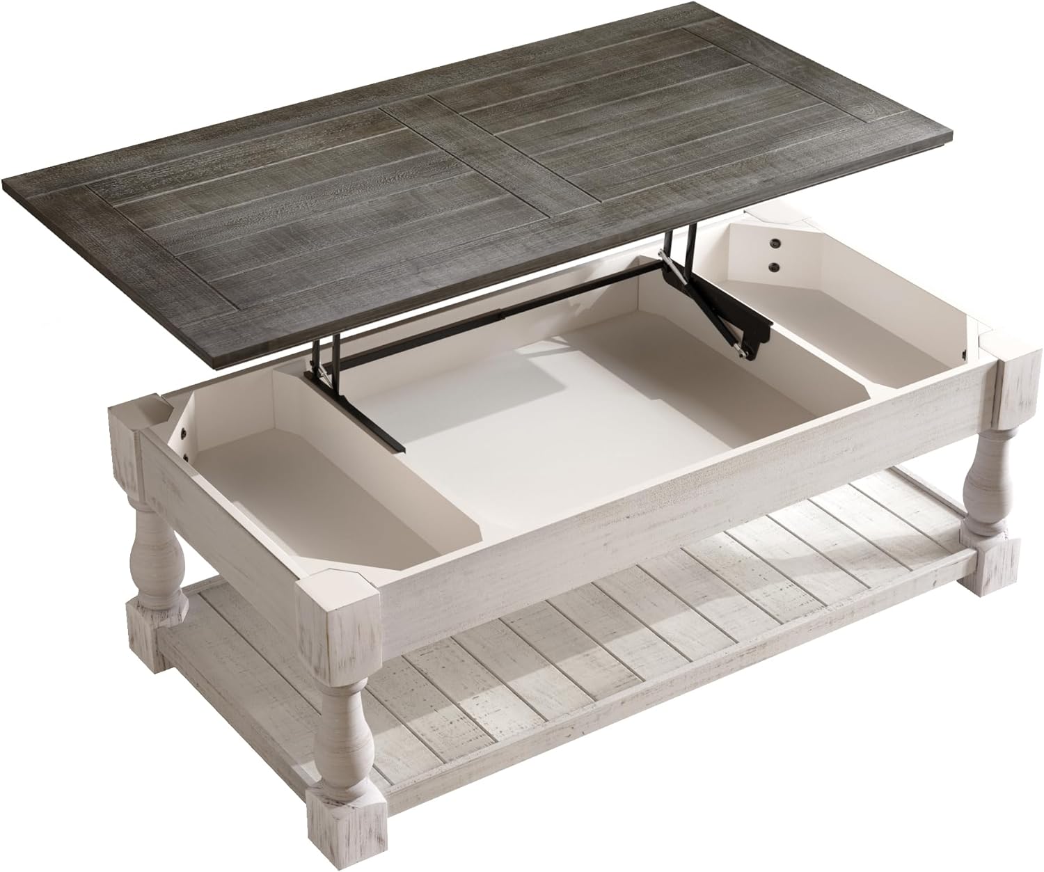 Product Features1. Lift-top Coffee Table: This coffee table features a stylish design and a perfect combination of storage space under the lid, the unique square shape with fluted design will effortlessly blend with your existing decor, whether you prefer a contemporary or minimalist style;2. Sturdy and Durable: Made of high-quality MDF, it has excellent stability and durability. The The solid wood veneer not only makes this coffee table more durable, but also can be kept as new after regular cleaning.3. Covert Storage: The hollow interior provides a hidden storage space for magazines, books, toys or your coffee table essentials within reach.4. Multifunctional Use: This coffee table can also be used as a decorative display table, or just as a simple accent piece for your living room, bedroom, office, or any places that needs extra storage.Specifications:Dimension: 47.24" x 23.6" x 18.11"Table Shape: RectangularFinish Type: LacqueredMain Material: Solid Wood+MDFWeight capacity: tabletop - 150lbs(when closed), 80lbs (when raised); interior - 100lbs.Package:1 x Lift-top Coffee TableNote:Real Product's Color may be a little different from the image due to the lighting or monitor's display.